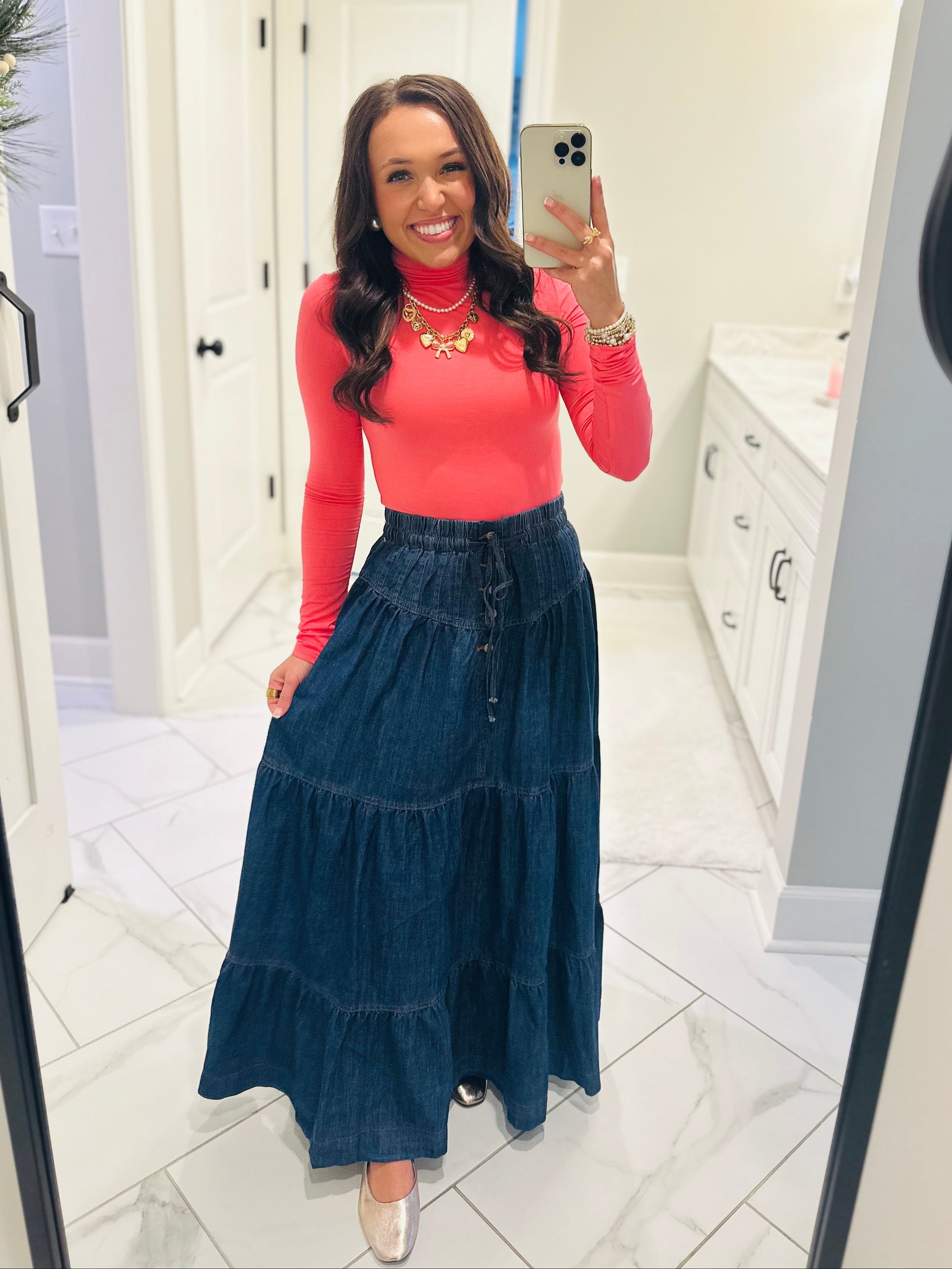 Keeping it simple, stylish, and comfortable with this new denim skirt! This skirt features a front button down detail with an adjustable bow tie. It also has pleated detailing with an elastic waistband. The tiered silhouette and the cotton material makes it the perfect skirt to wear all year around. Dress it up with a cute top or sweater or keep it casual with a pullover or graphic tee. The options are endless!