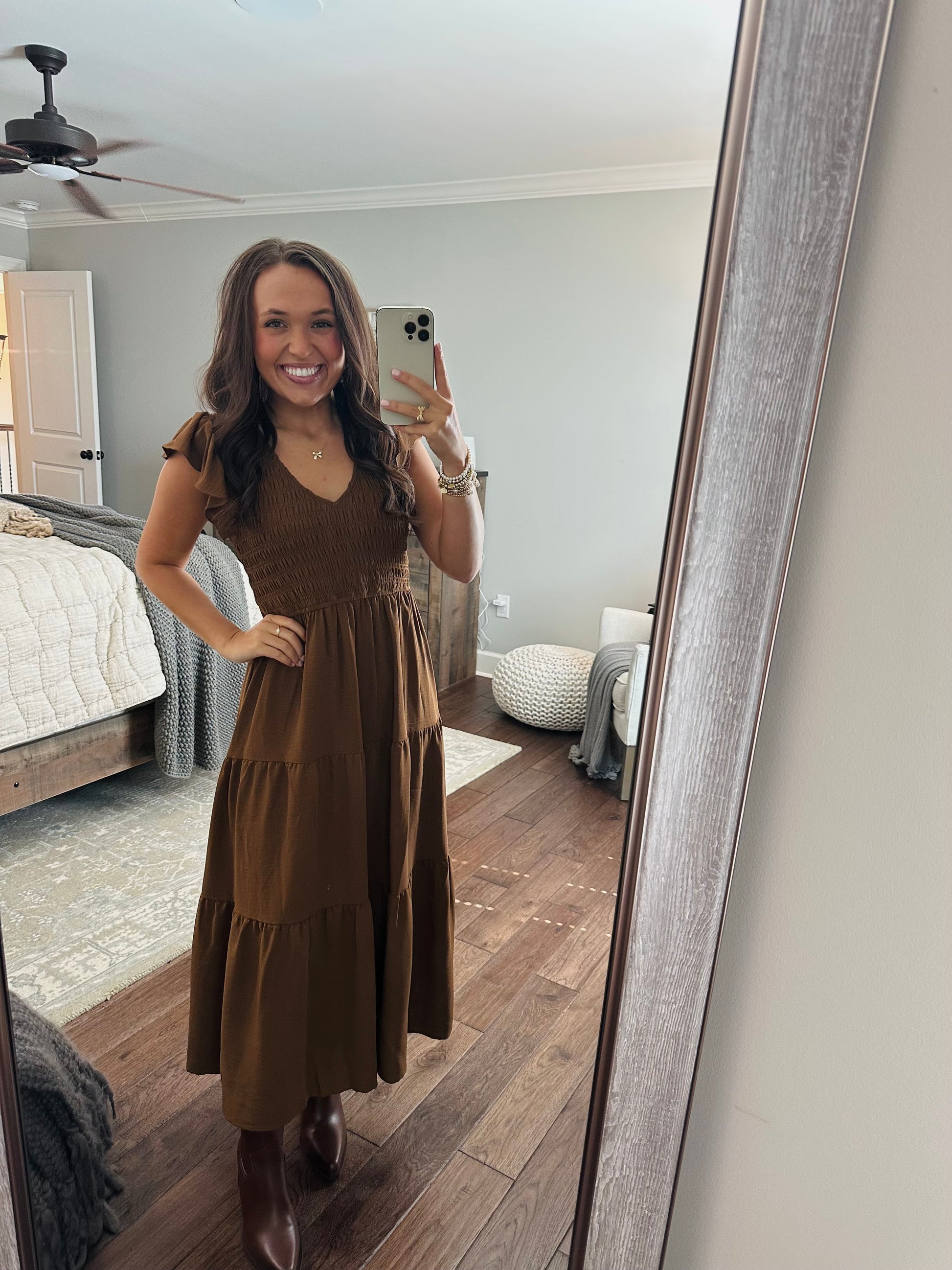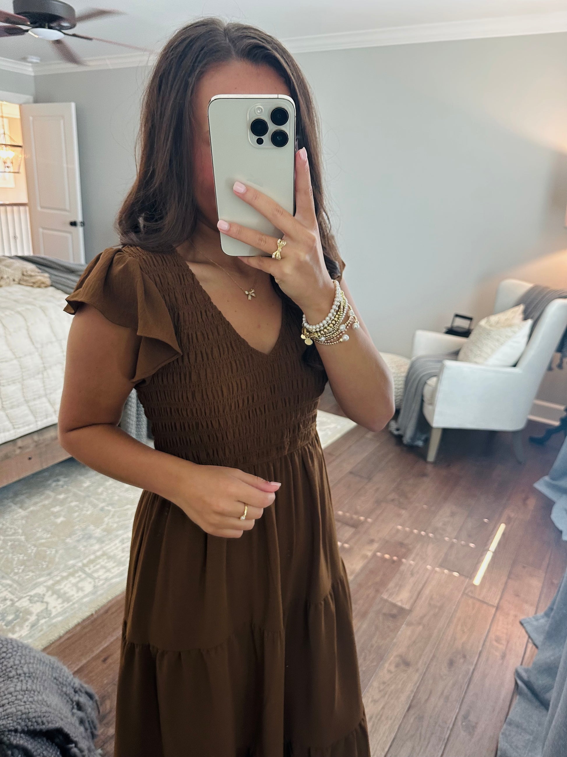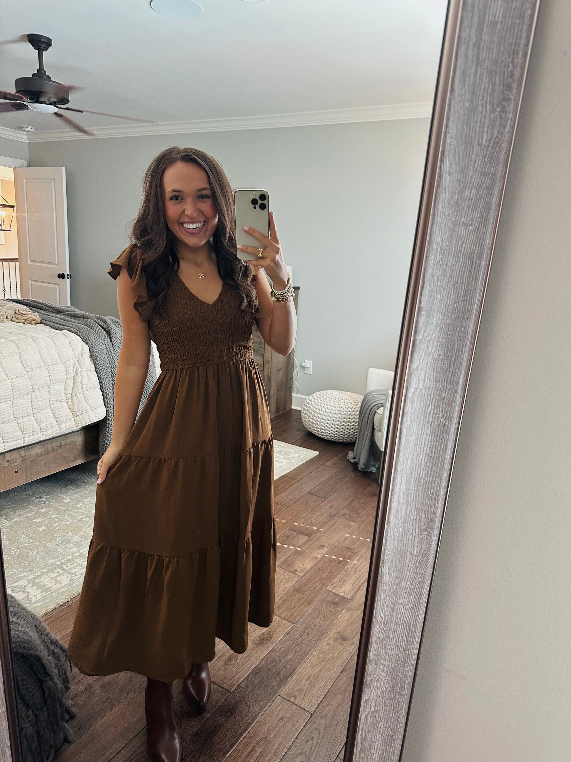 The Maple Copper Brown Flutter Sleeve Smocked Midi Dress