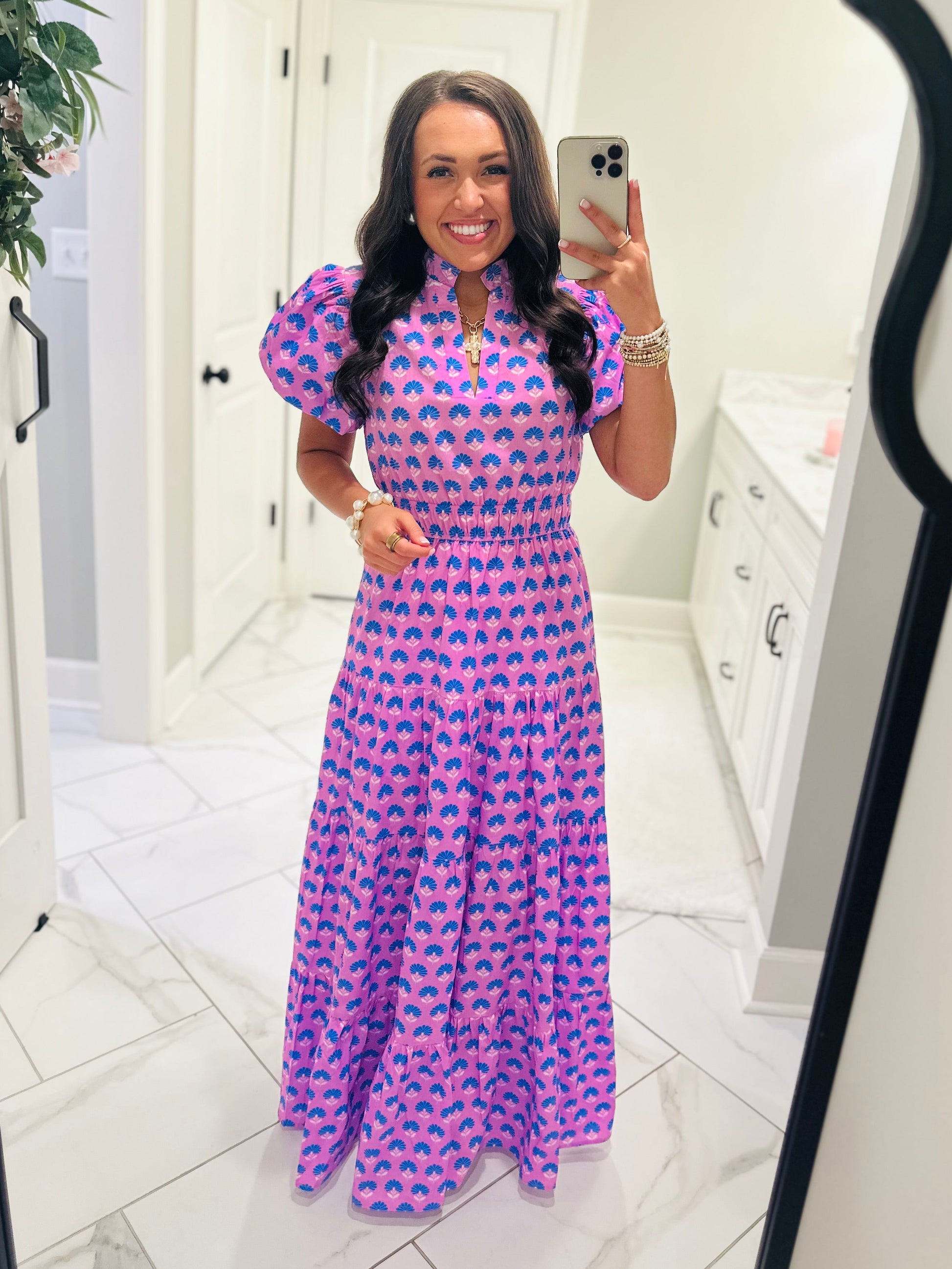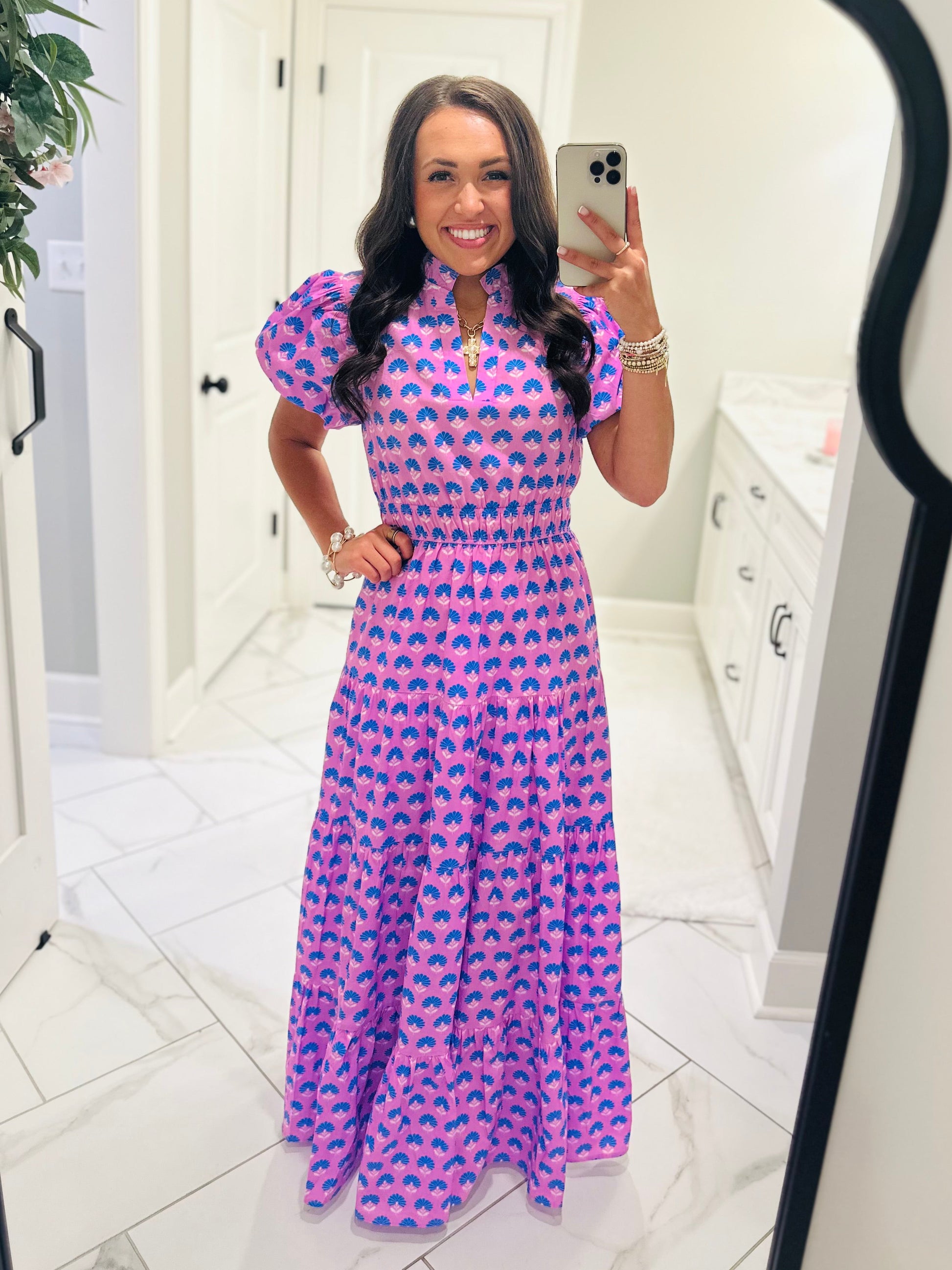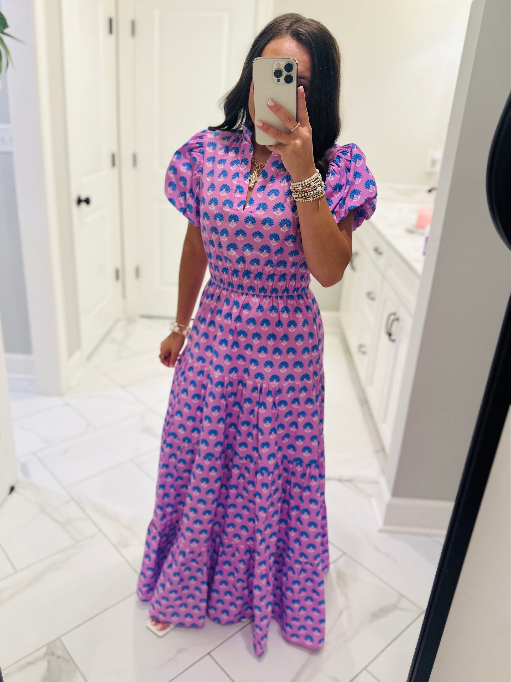 This new color way in our best-selling style of dress comes in sizes SMALL - 2XL !!!! 💜 We are so excited to now be carrying extended sizes. This beautiful dress features a gorgeous lavender multicolor floral print with short puff sleeves, a smocked elastic waistband, and hidden side pockets. It's comfy, classy, and the perfect midi dress for the spring and summer. Talk about the perfect Easter dress... here she is!Â