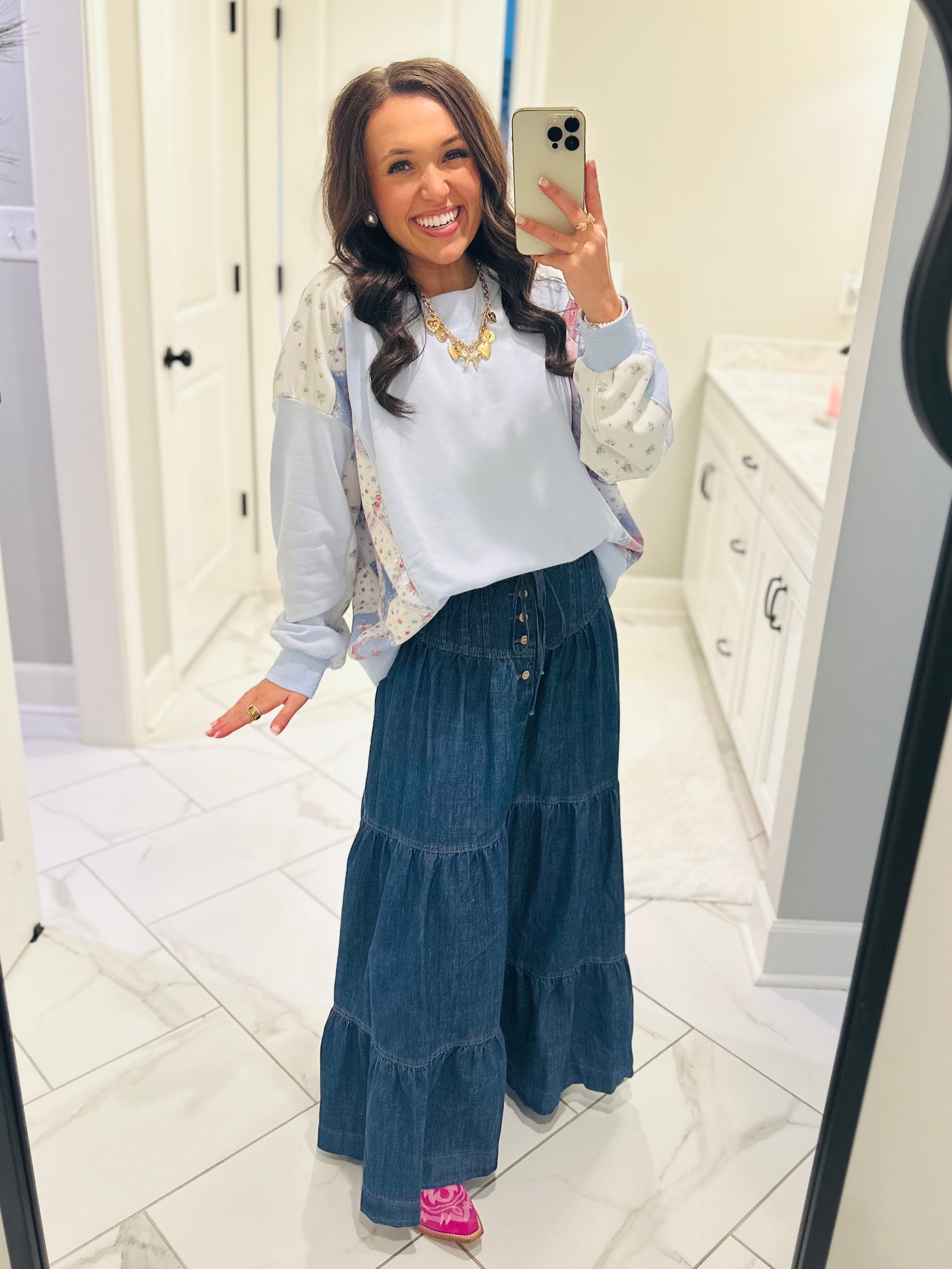 Patchwork perfection. ✨ This new pullover is so beautiful. It features a fun blue multicolor pastel color combo in a patchwork print. It has a round neckline, drop shoulder, and it is slightly oversized. It's the perfect piece for now and all through the spring. These won't last long!