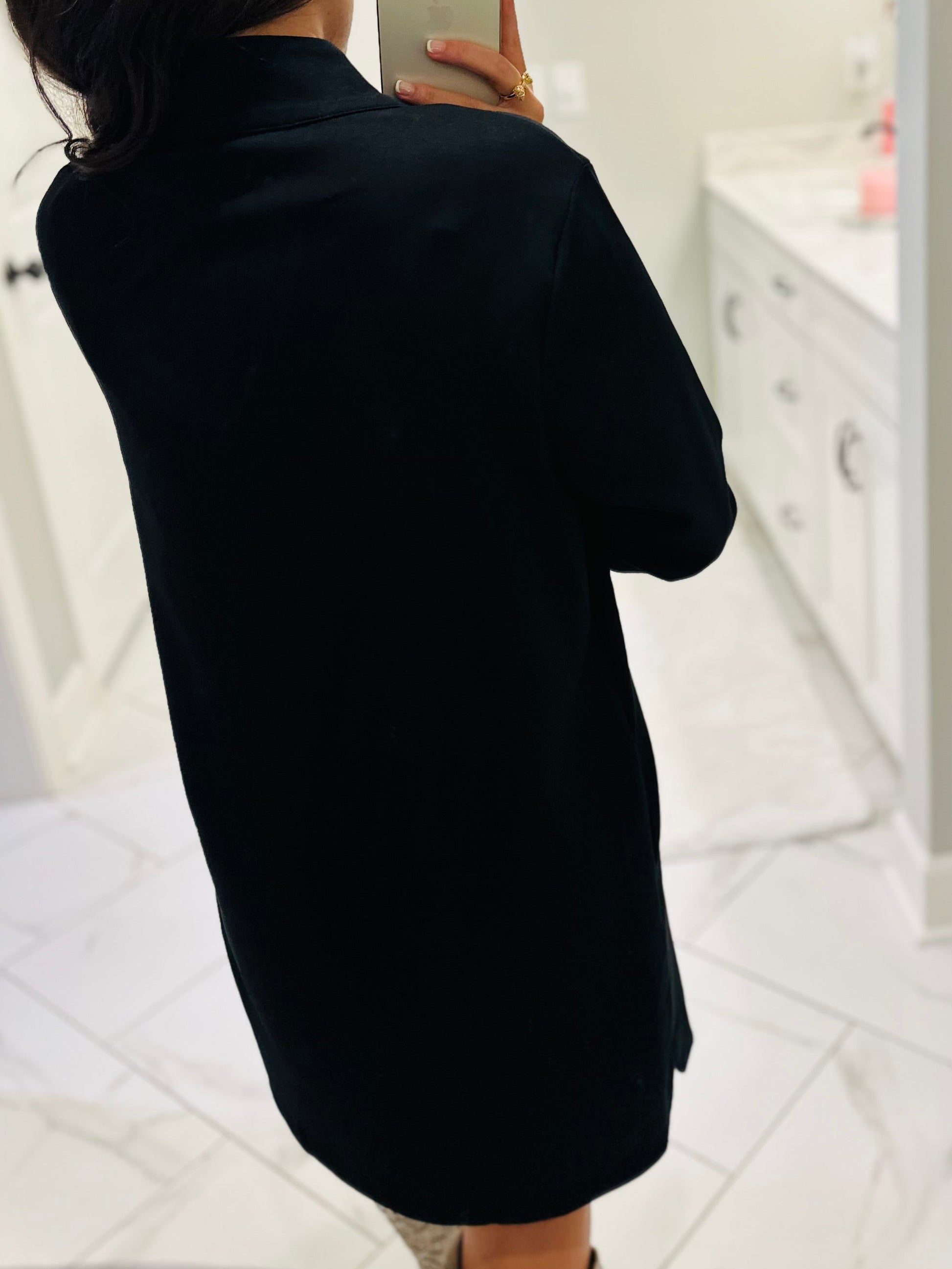 The perfect blend of comfort and style! This new dress is SO cute, comfy, and cozy for the fall and winter. It features a solid black print with long sleeves, a split v-neck with a stand collar, and it does have pockets. It's the perfect dress to wear causal with sneakers or booties and dress up with heels and boots. This will become a staple in your wardrobe!