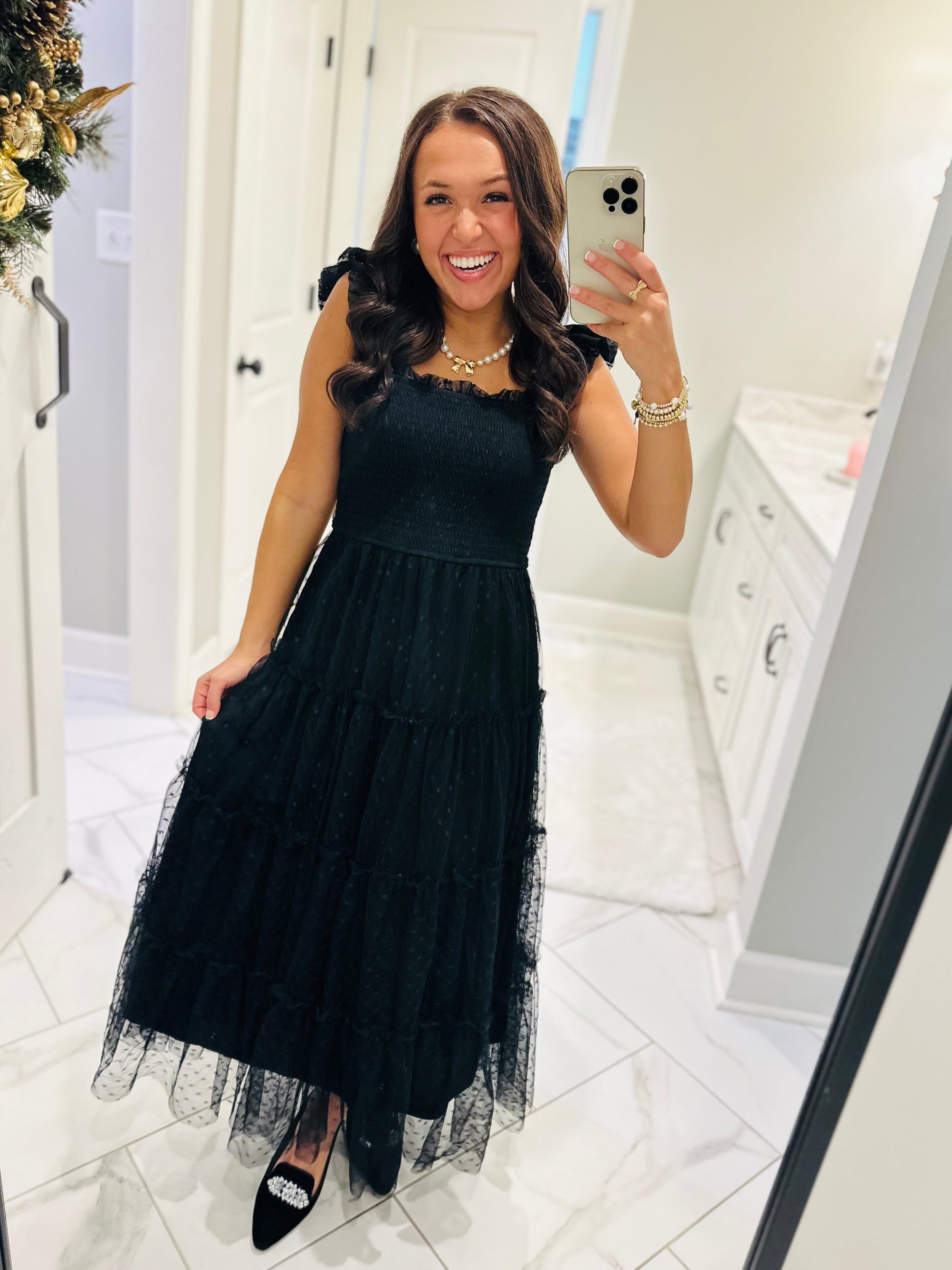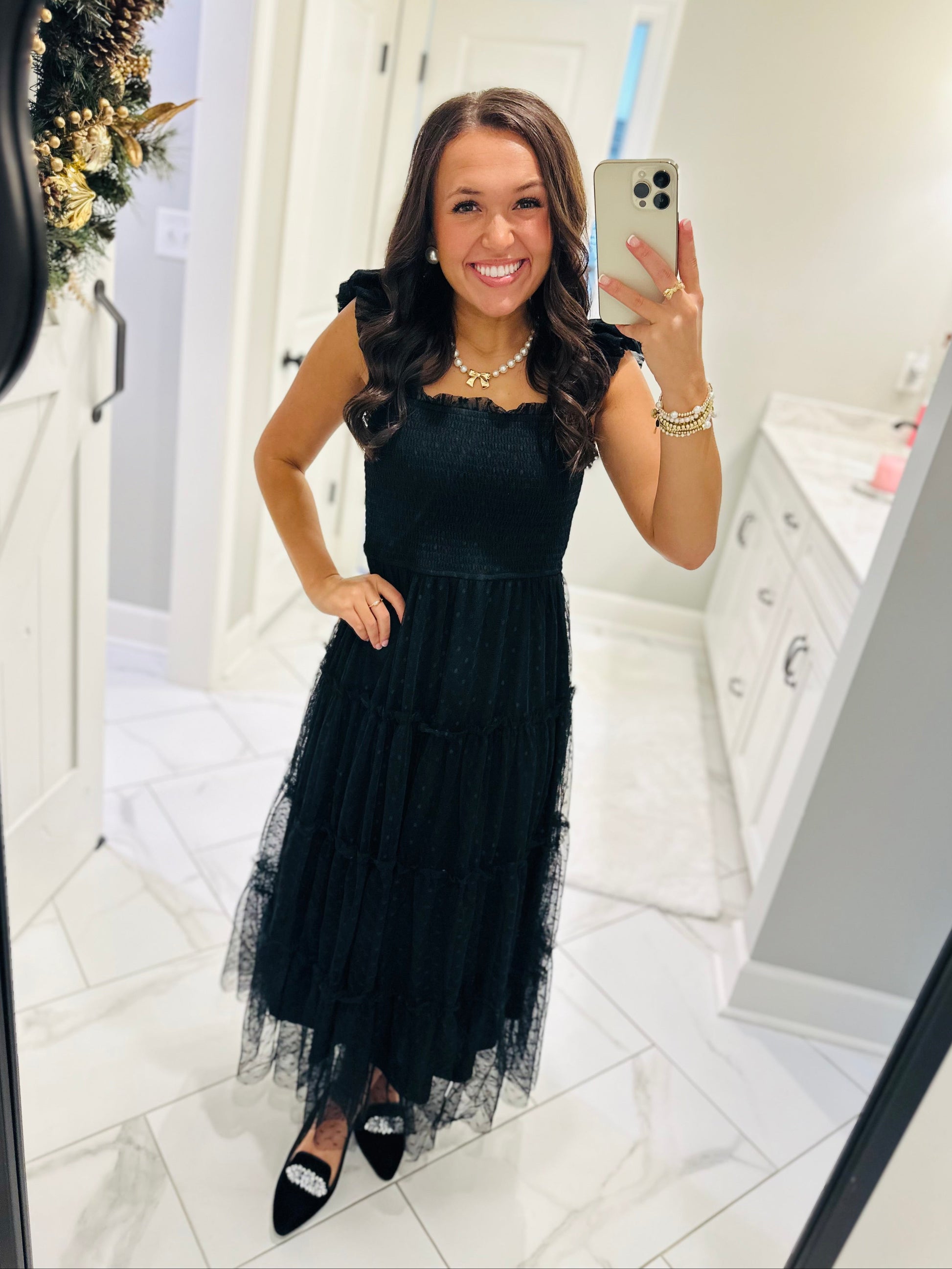 The little black dress you NEED!! This new arrival is the perfect holiday + winter dress that can also be warn in the warmer months. This dress features a beautiful black polka dot chiffon print with a smocked bodice that is midi length.