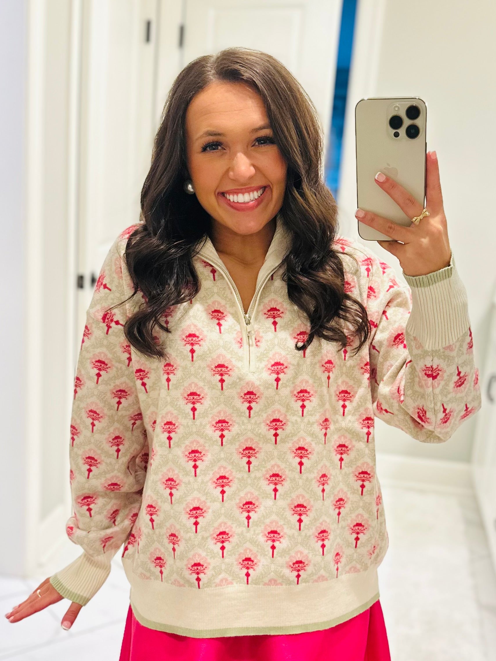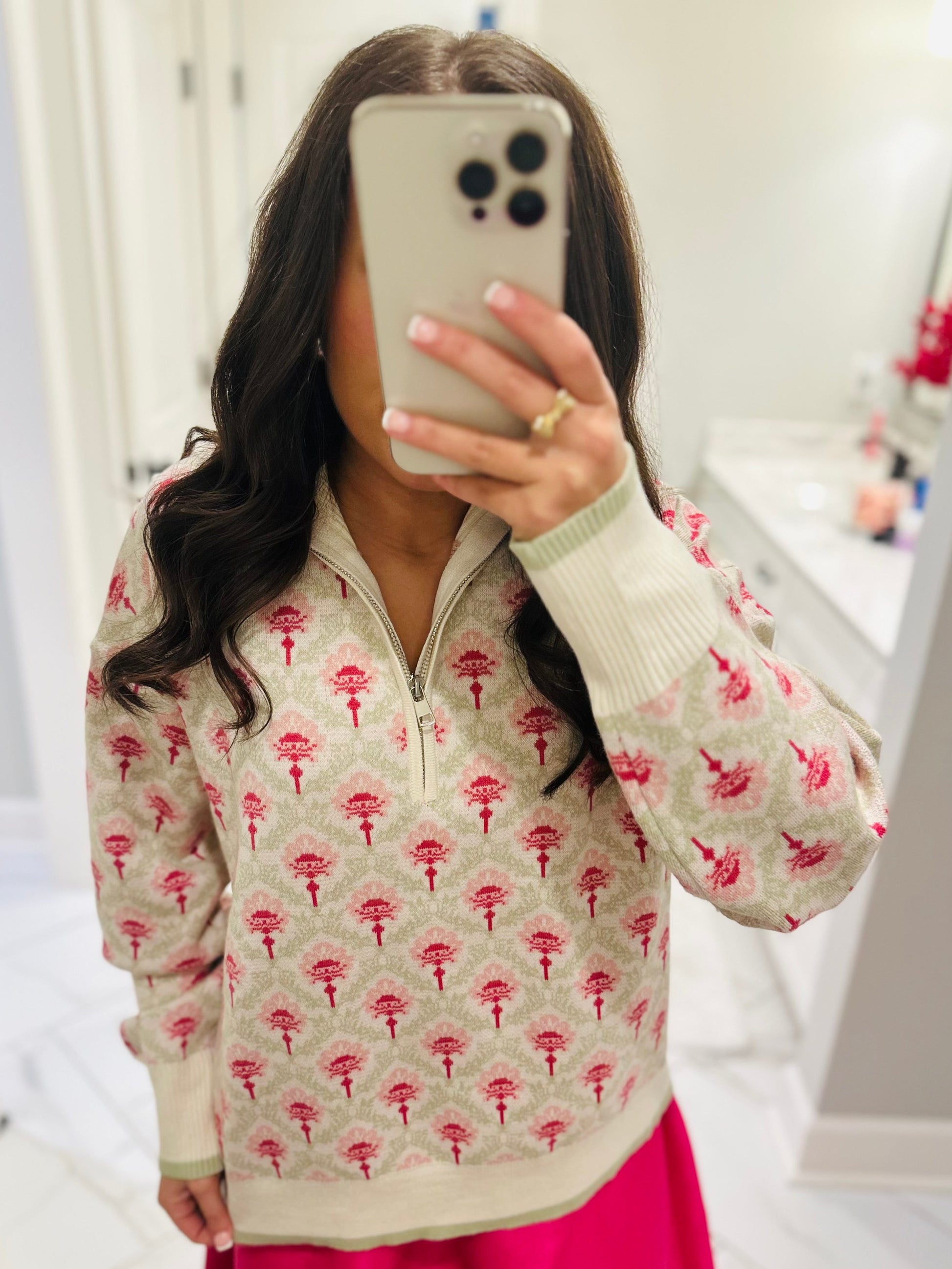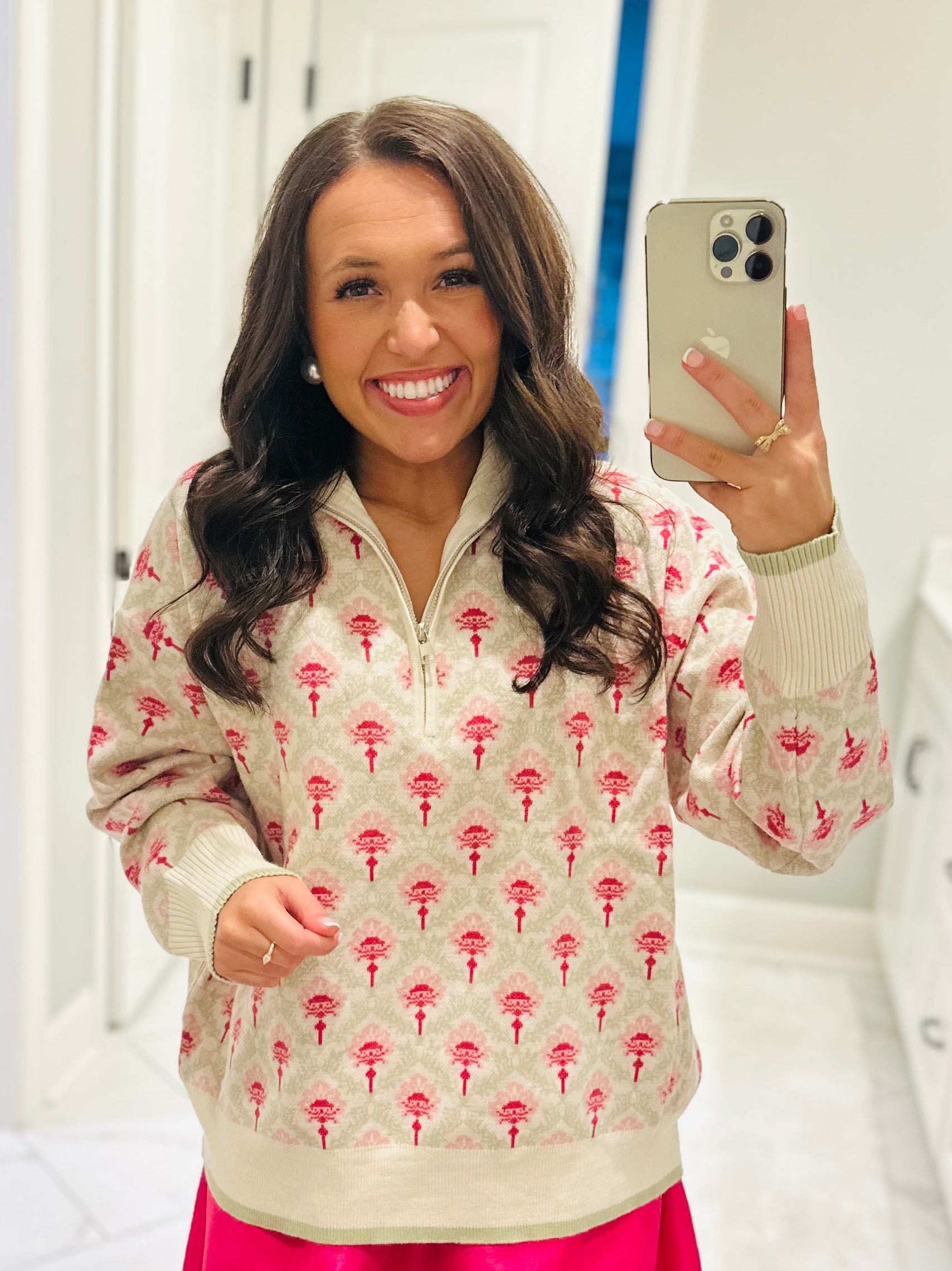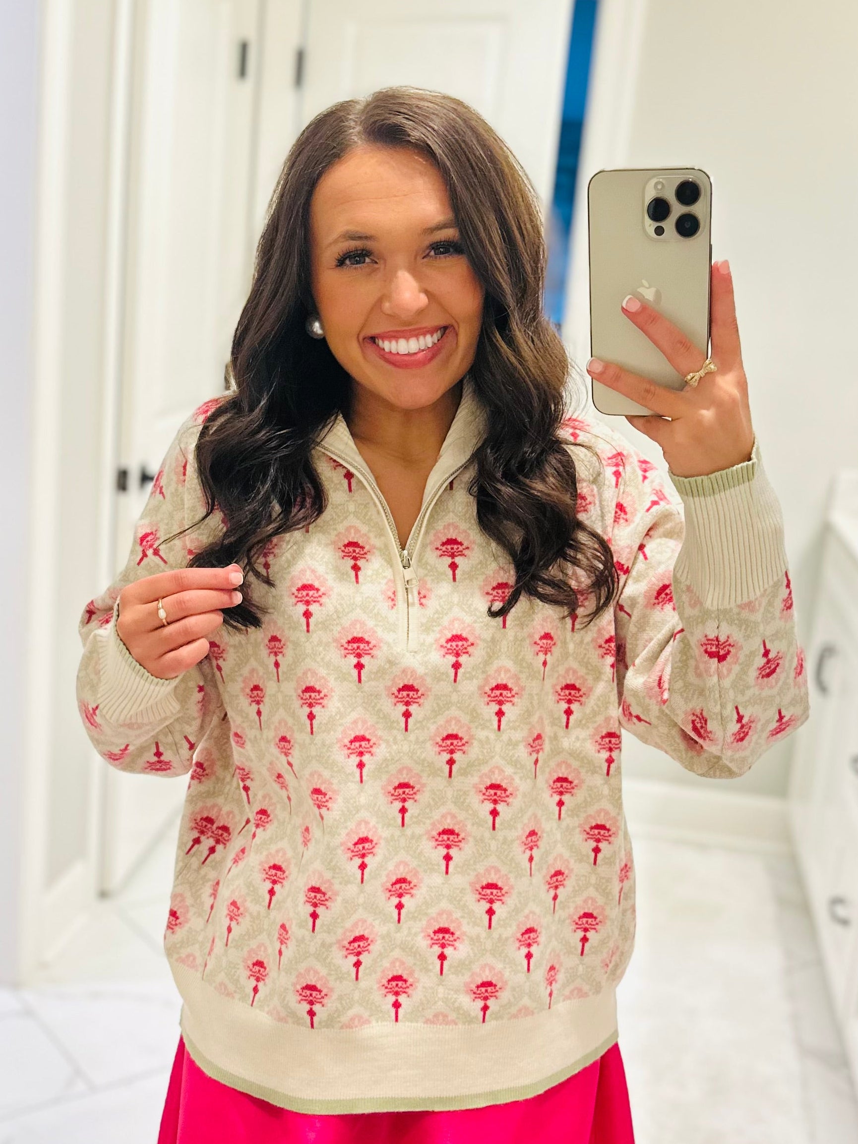 Just a girl in her new favorite half-zip! This new pullover features a beautiful floral oat sage multicolor design throughout. This cozy sweater pullover features a classic mock neckline, half zip, and comfortable drop shoulder long sleeves. Contrasting ribbed knit accents the neckline, cuffs, and hem. The relaxed bodice falls to the perfect length for all your high-waisted favorites. With this floral knit half zip pullover, putting together an adorable seasonal look is simple!