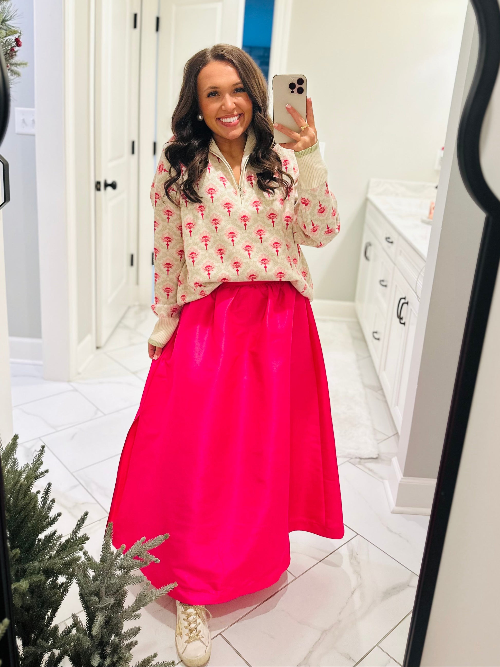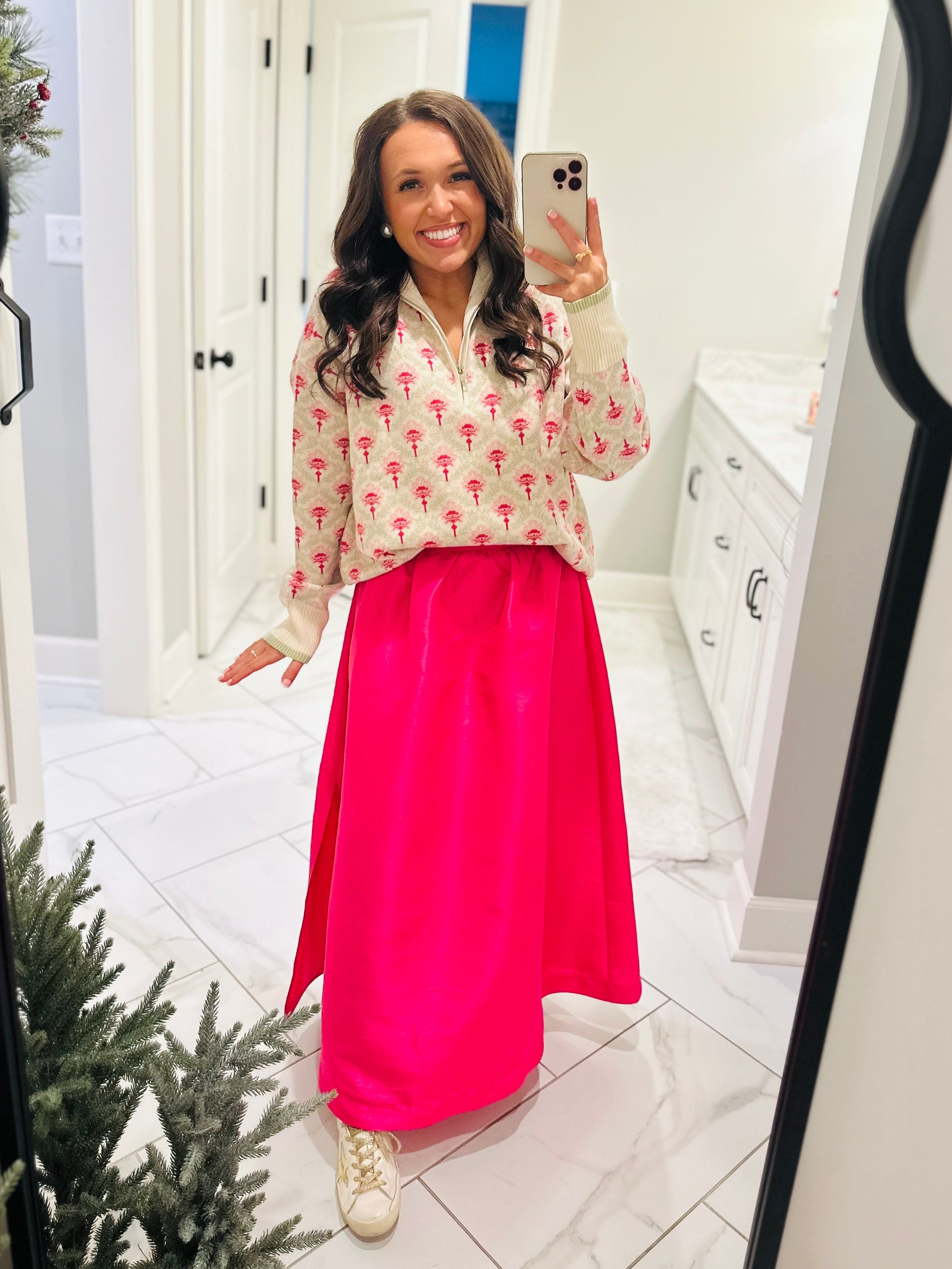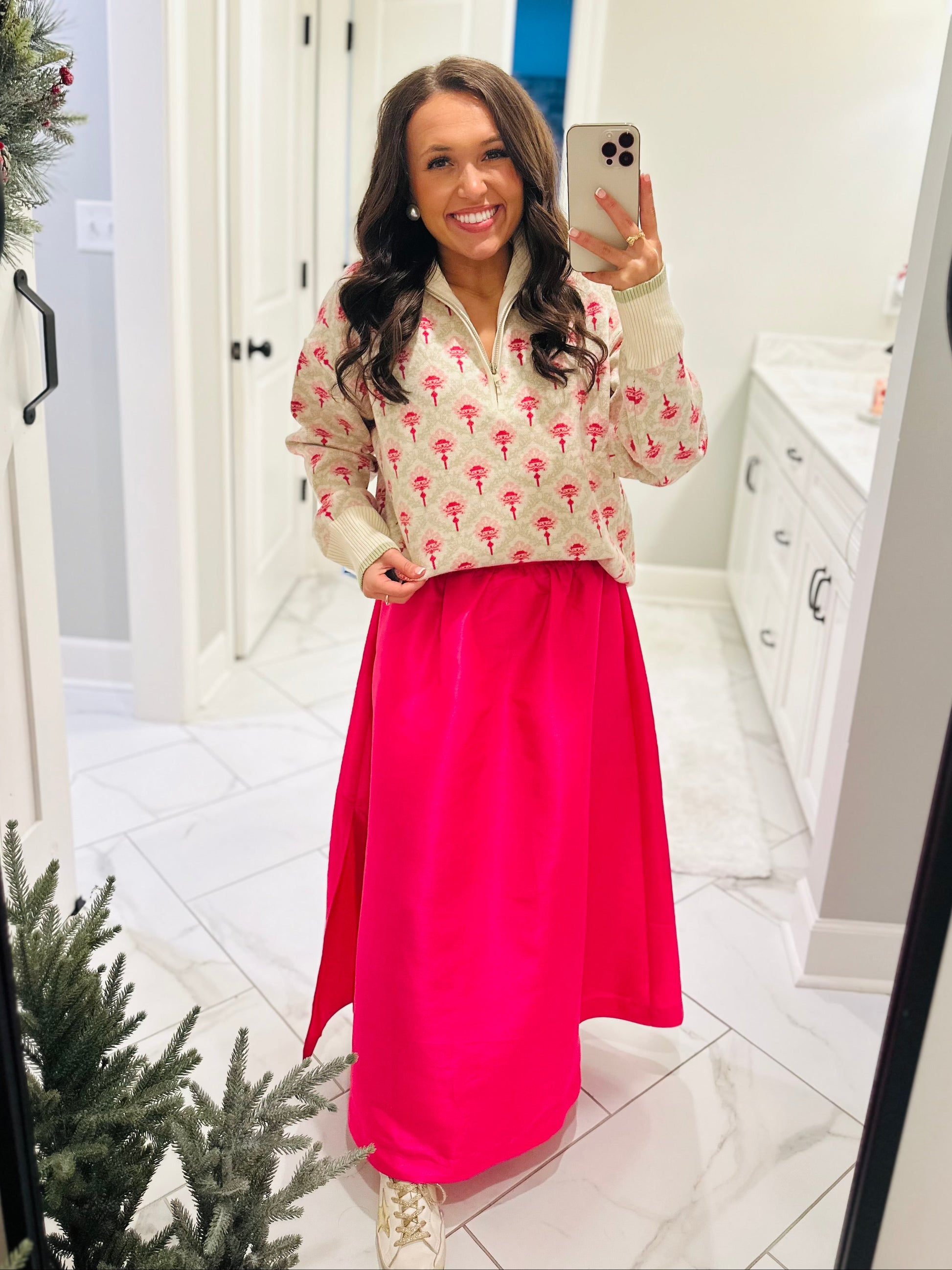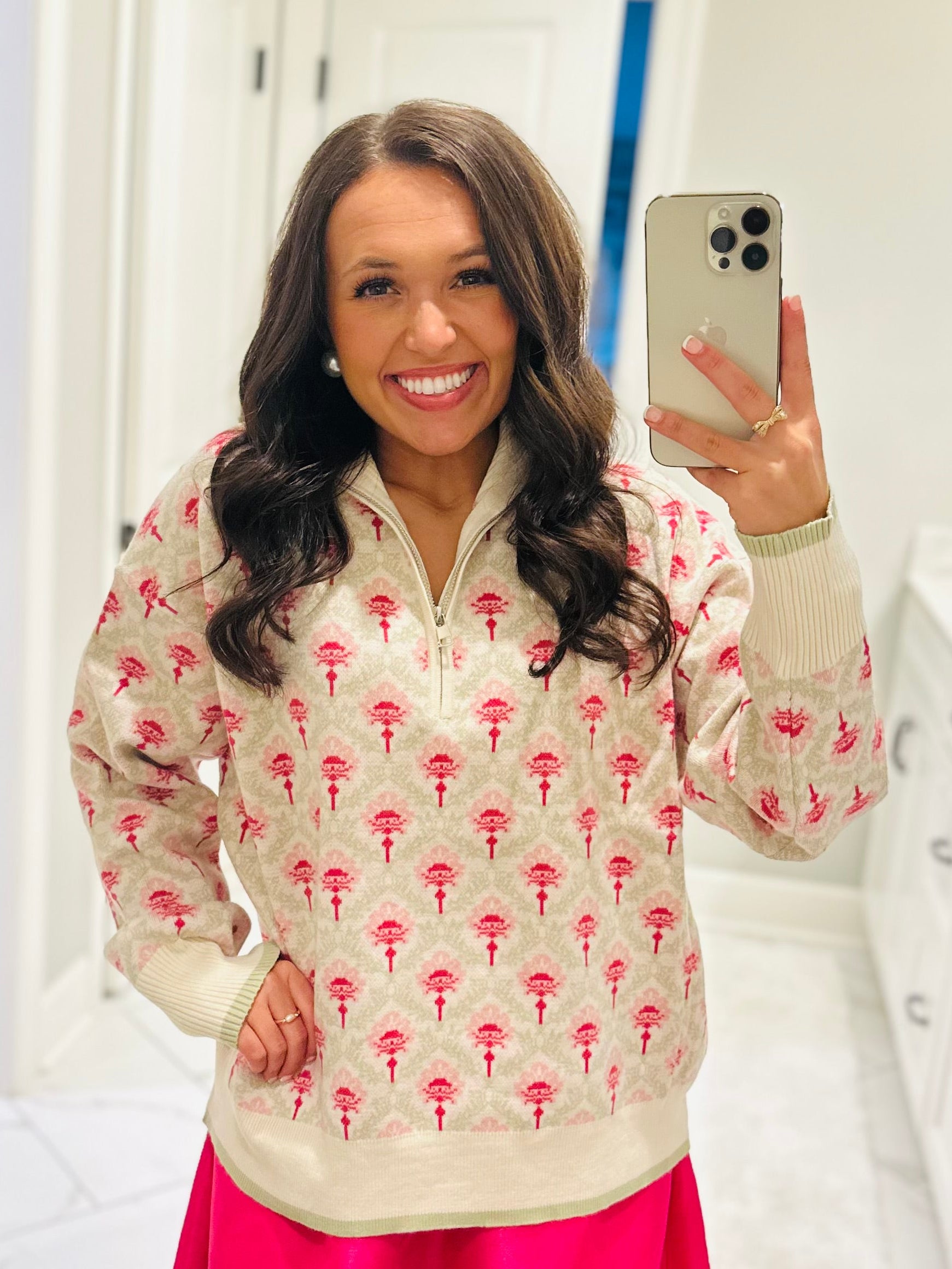 Just a girl in her new favorite half-zip! This new pullover features a beautiful floral oat sage multicolor design throughout. This cozy sweater pullover features a classic mock neckline, half zip, and comfortable drop shoulder long sleeves. Contrasting ribbed knit accents the neckline, cuffs, and hem. The relaxed bodice falls to the perfect length for all your high-waisted favorites. With this floral knit half zip pullover, putting together an adorable seasonal look is simple!