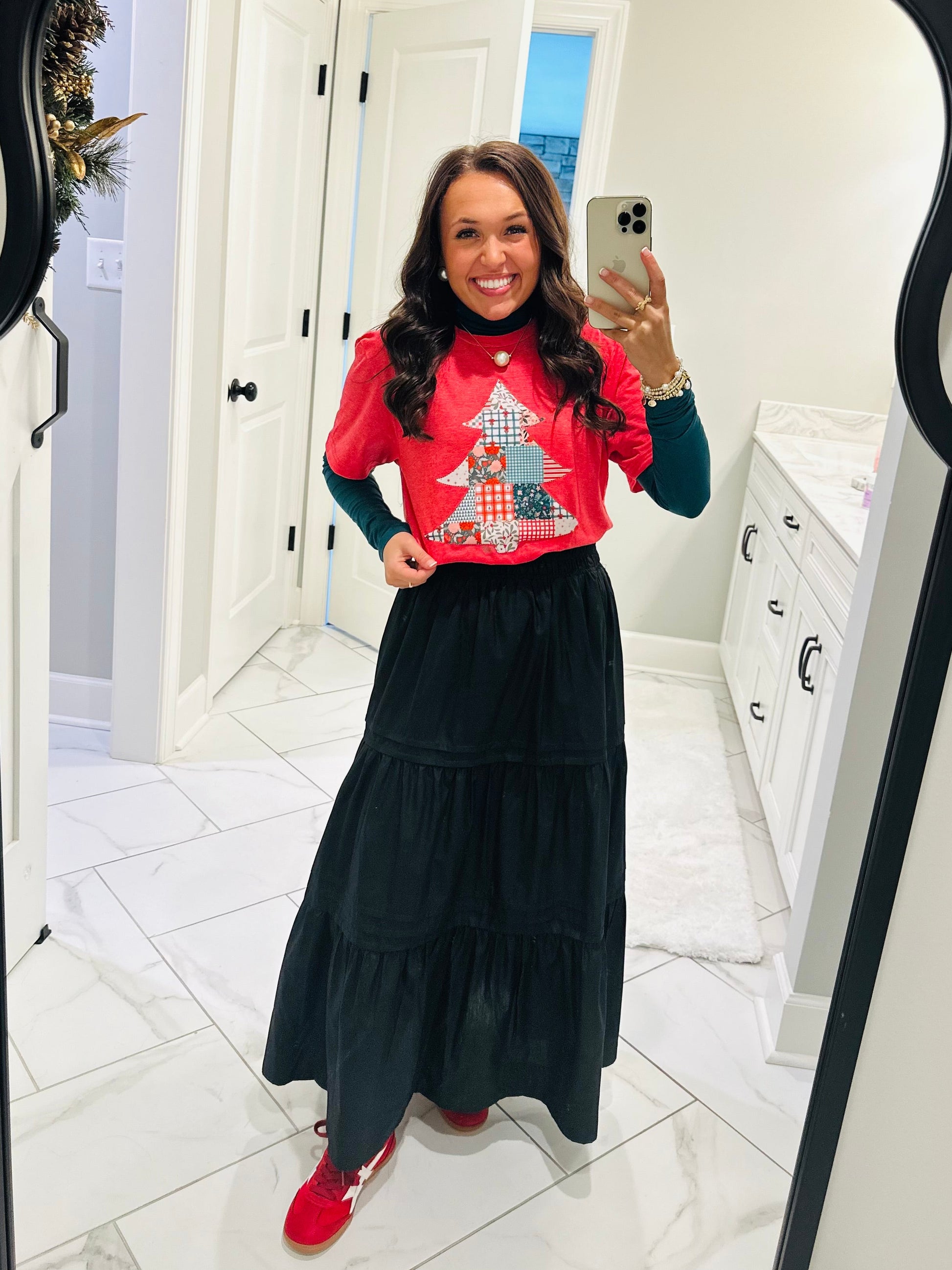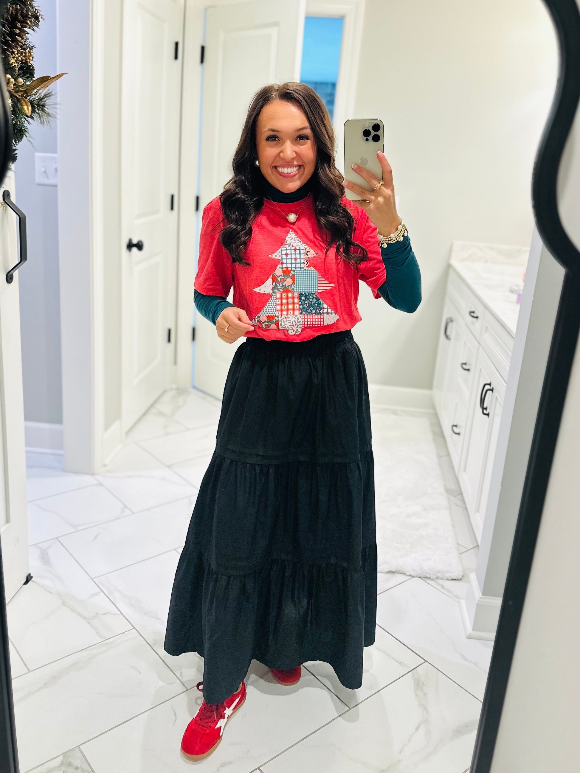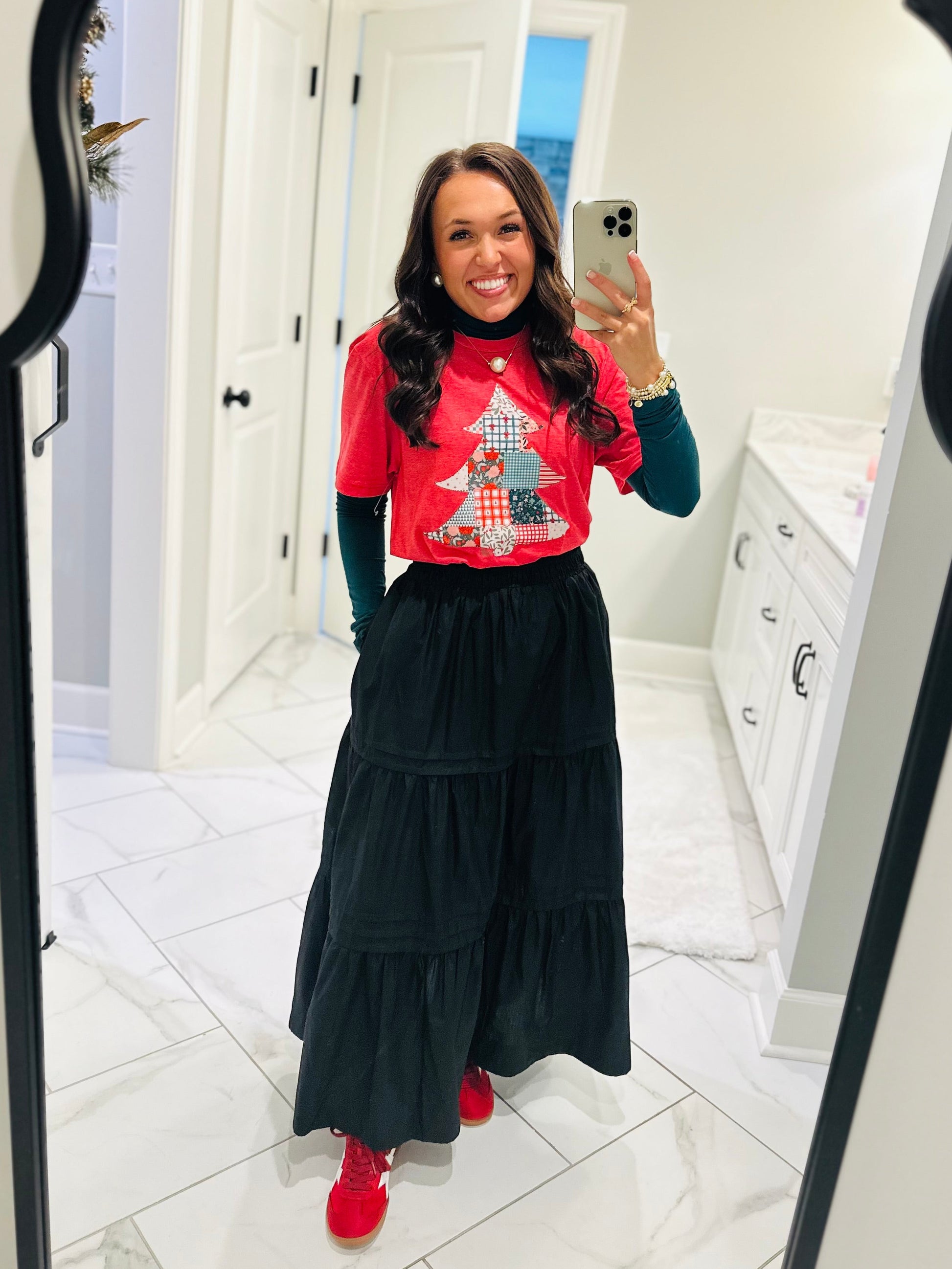 BLACK MAXI SKIRT SHOWN STYLED WITH TEE: