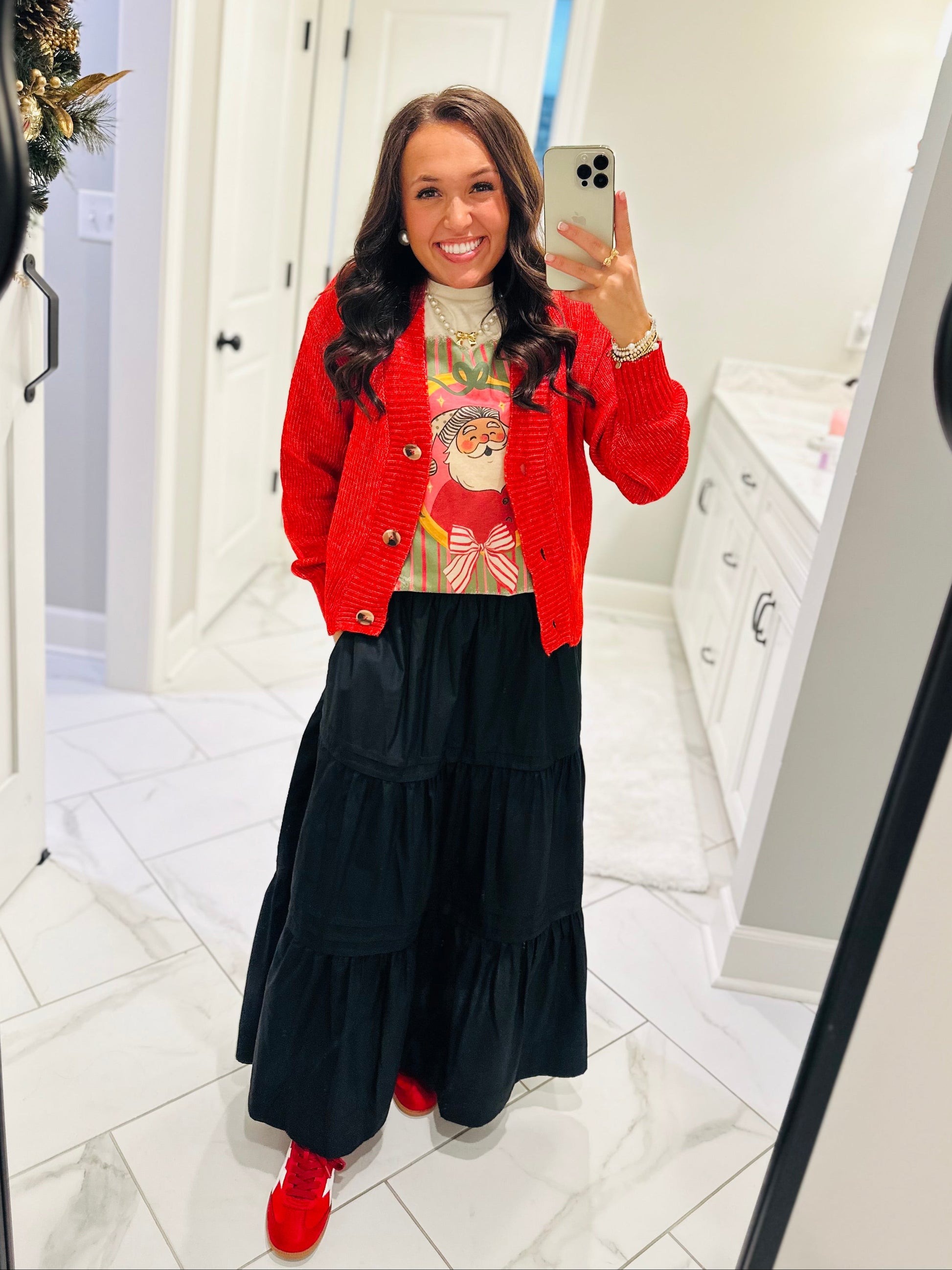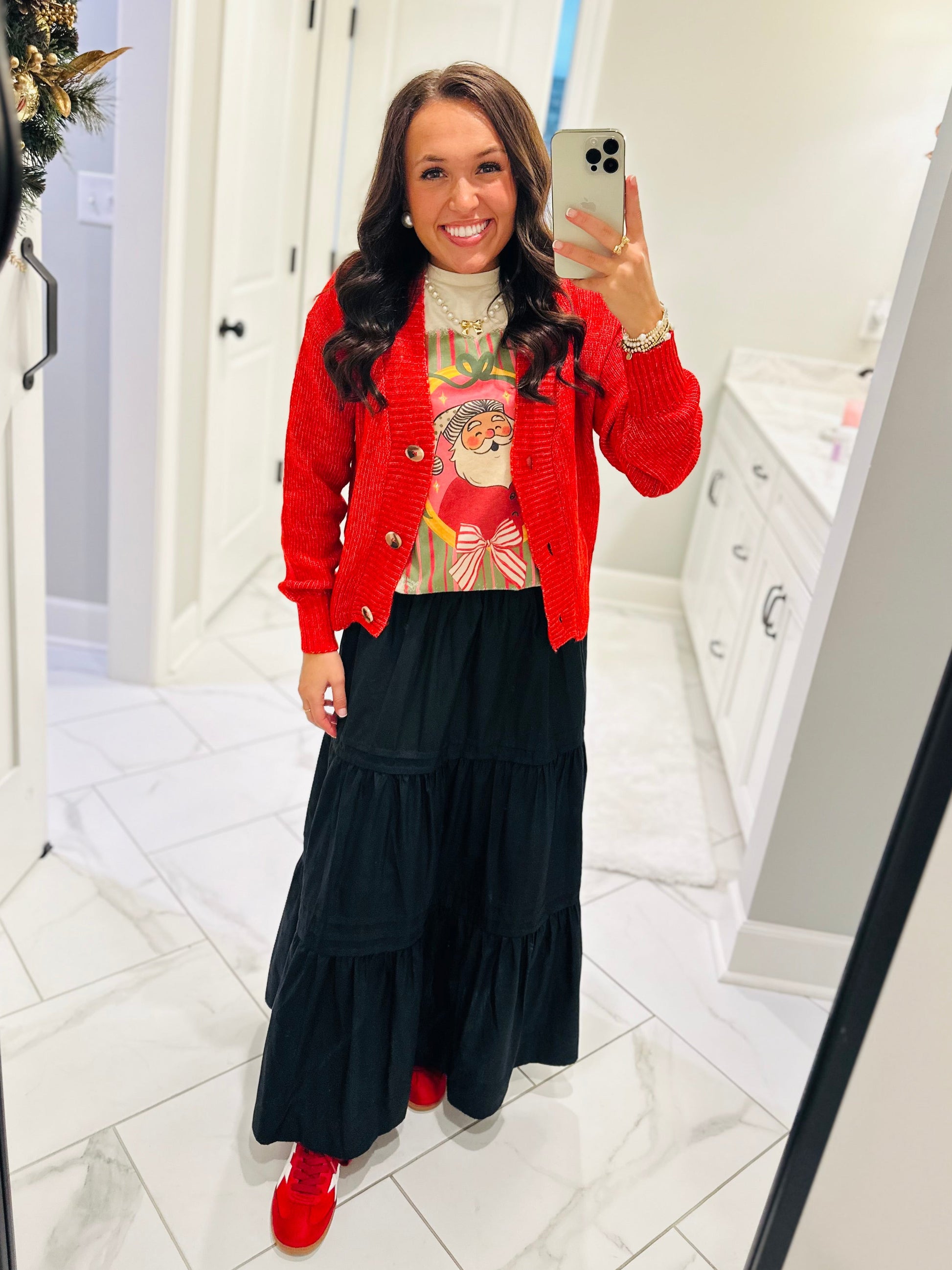 RED CARDIGAN STYLED WITH OUTFIT: