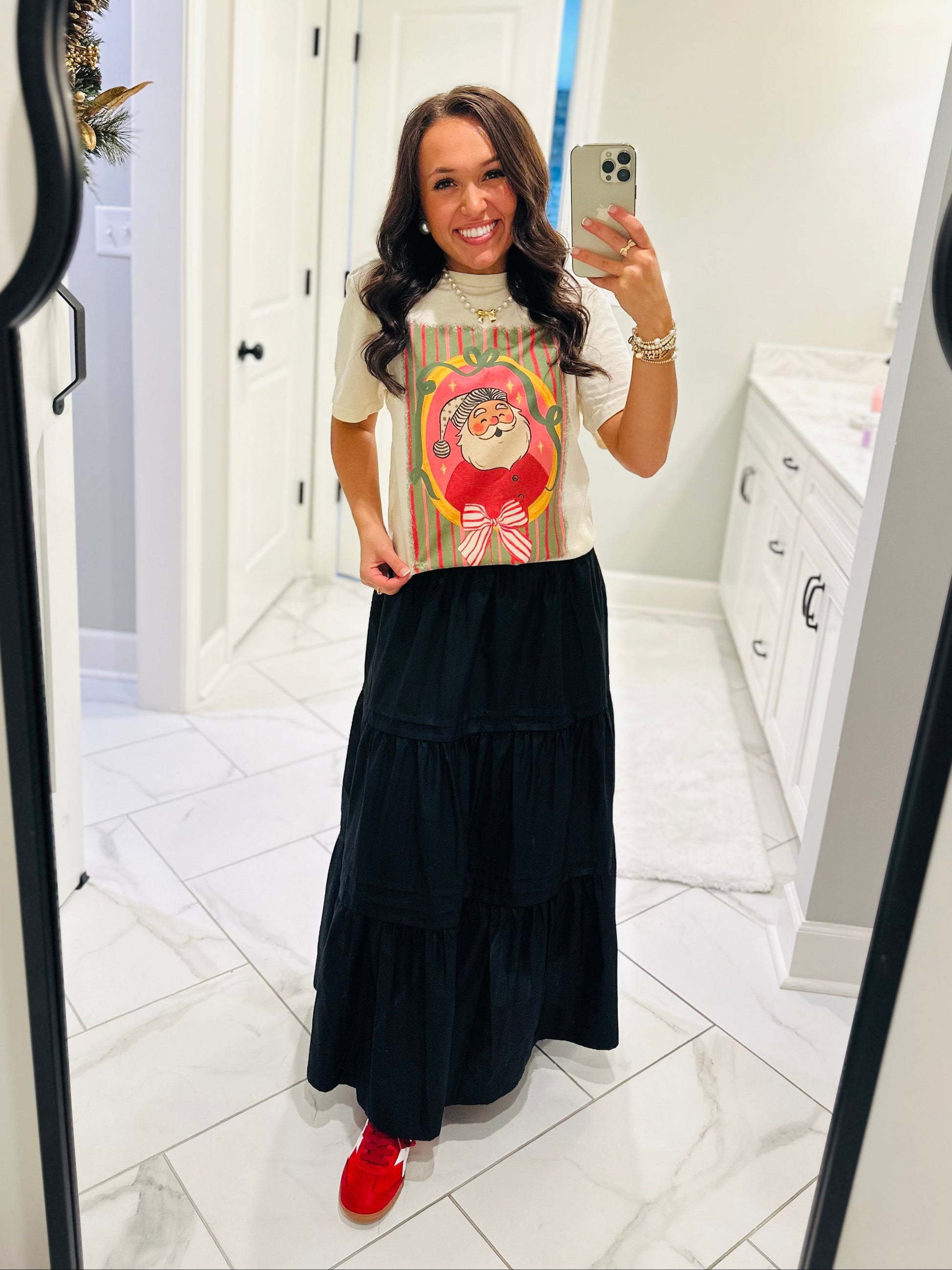 Vintage vibes and timeless Christmas feelings in this adorable new tee! This tee features the prettiest and simplest retro Santa Claus design with crystal embellishments. It's the perfect tee for every event this holiday season. Layer a cardigan over it or a turtleneck underneath it. There are so many ways to style this adorable tee!