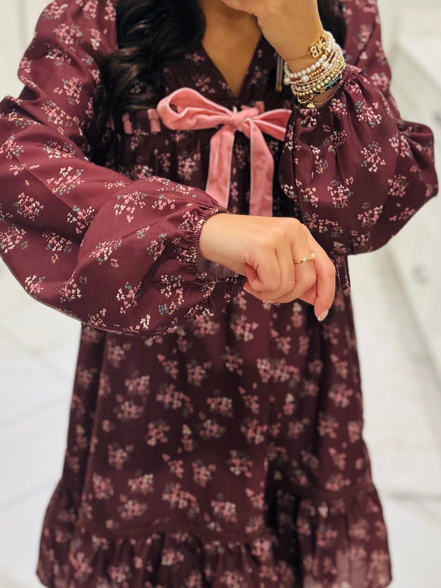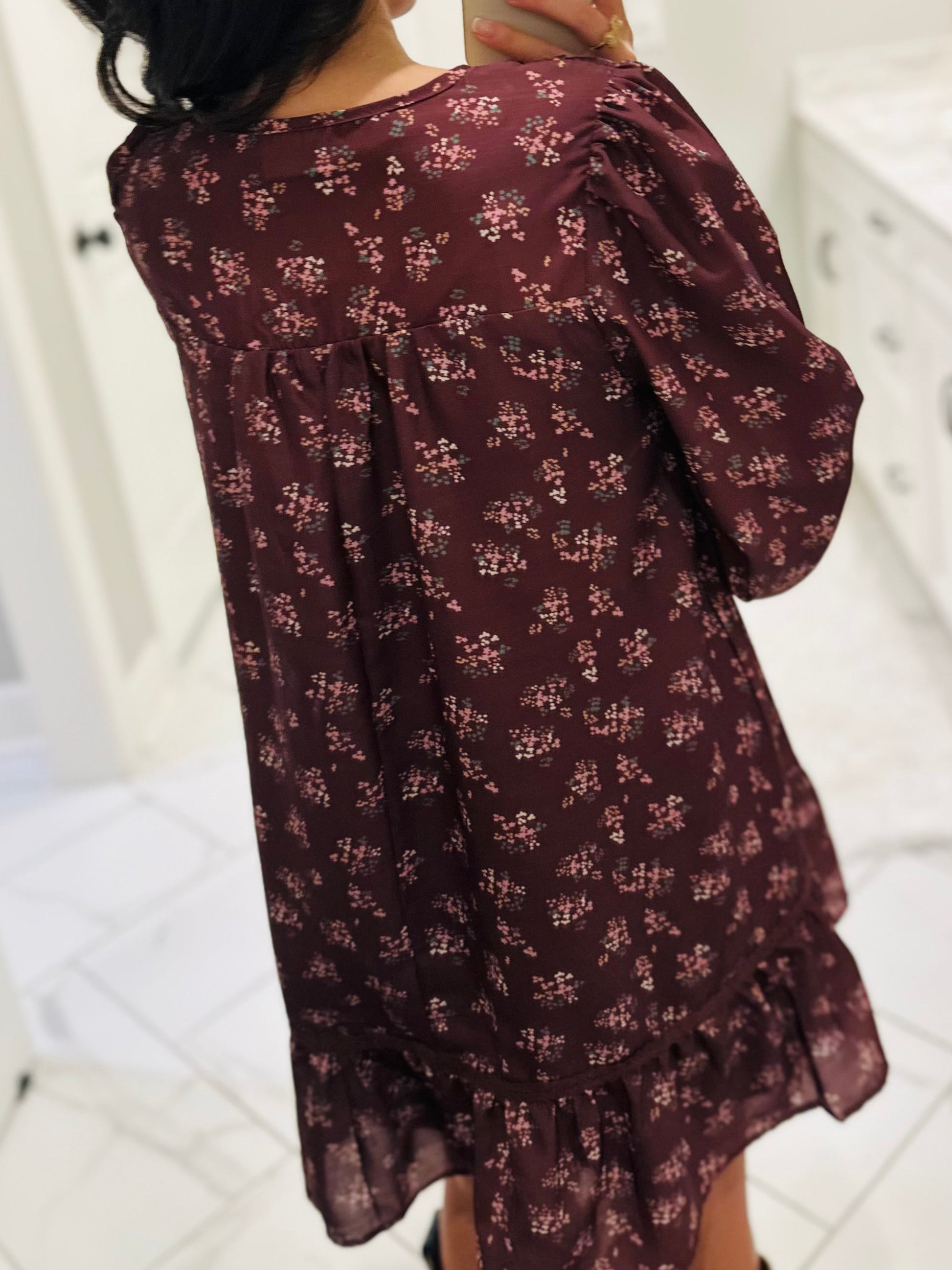 Just me and my new favorite bow-tiful dress! This gorgeous new arrival is the perfect little everyday dress. It is perfect for every occasion as you can dress it up or keep it casual. This dress features a beautiful chocolate brown floral print with long sleeves and crochet lace trim detailing. It has features a fun front velvet bow tie detailing. It's the perfect detail for this cutie dress. These won't last long - shop now!