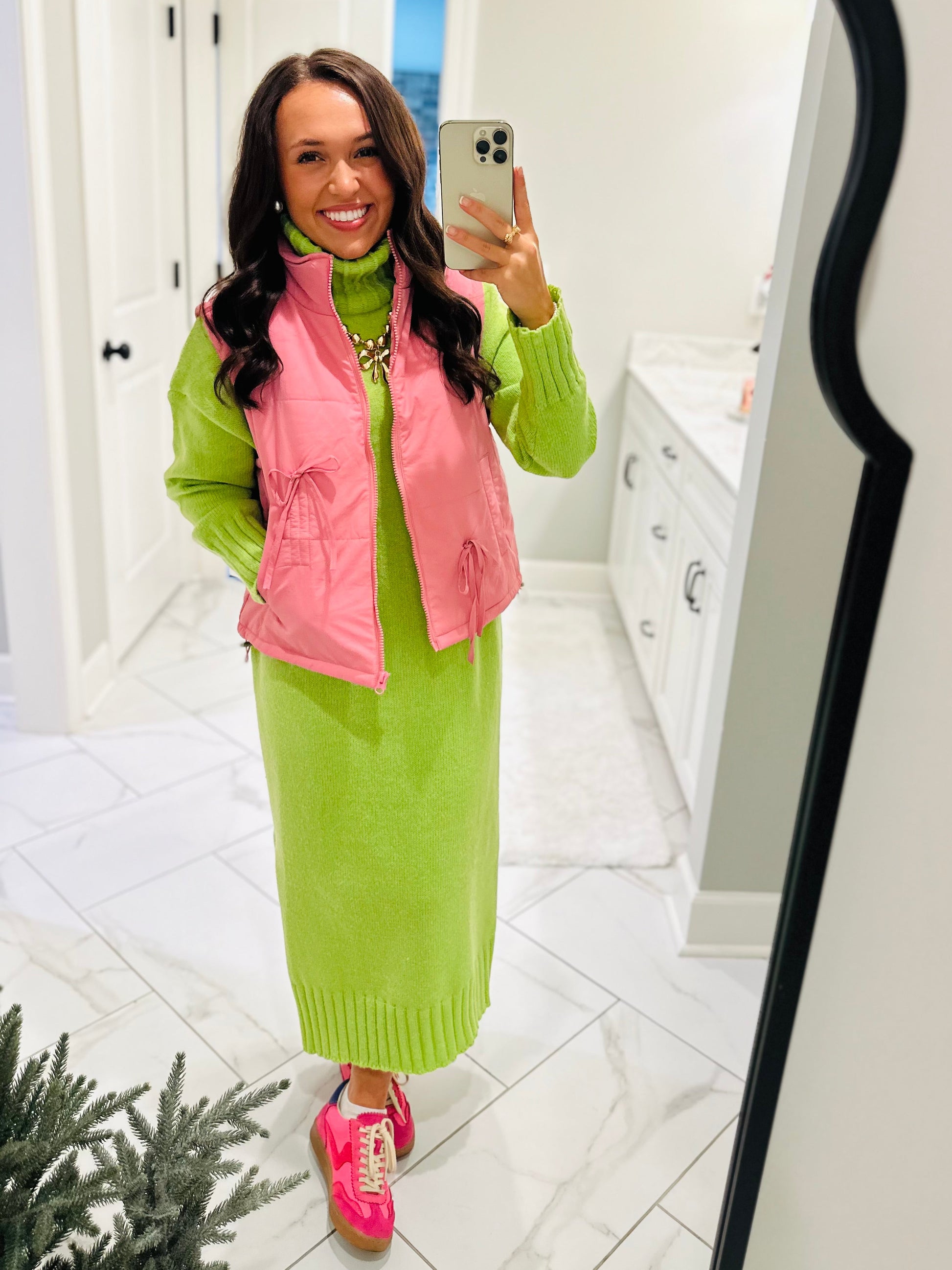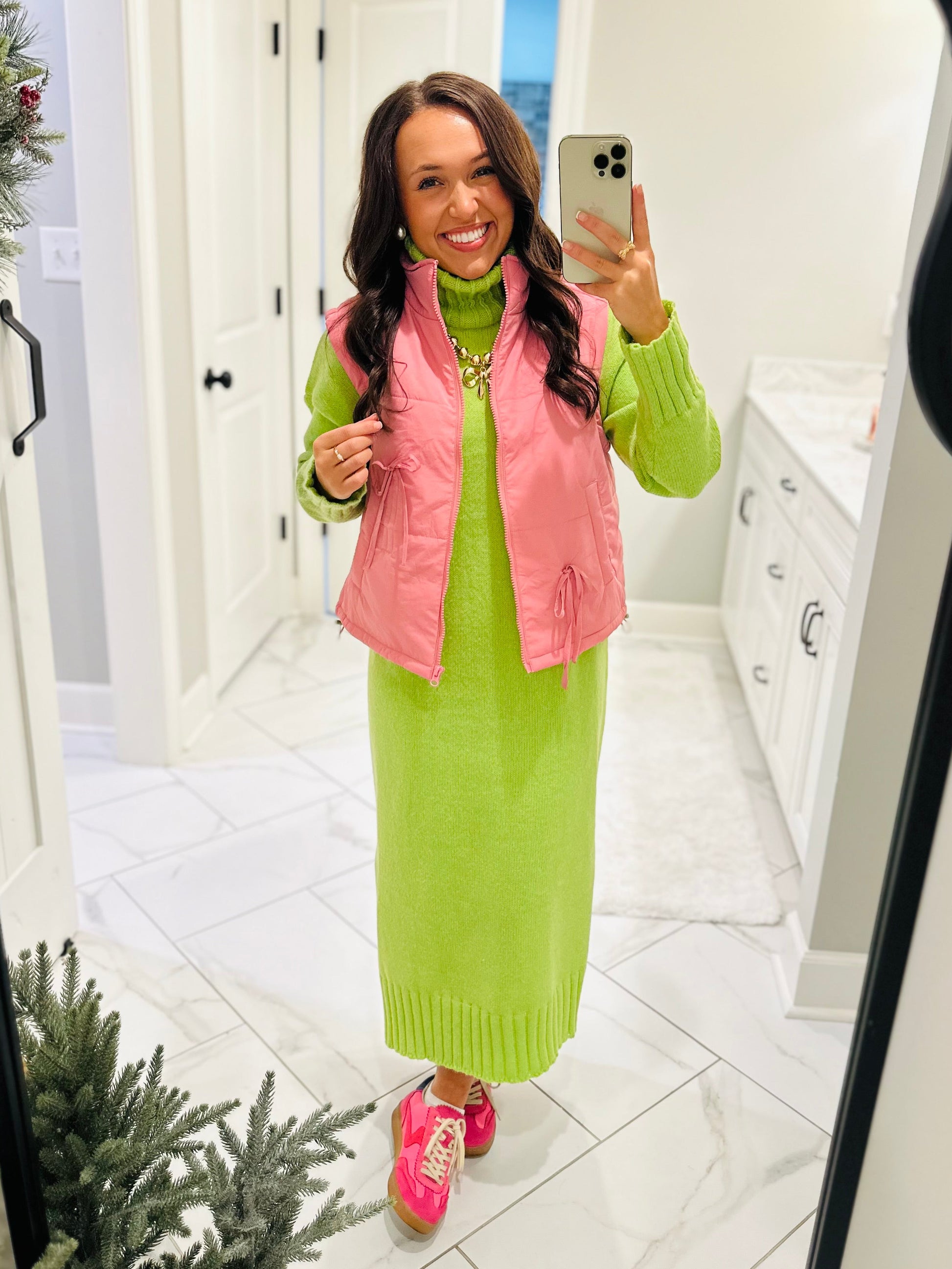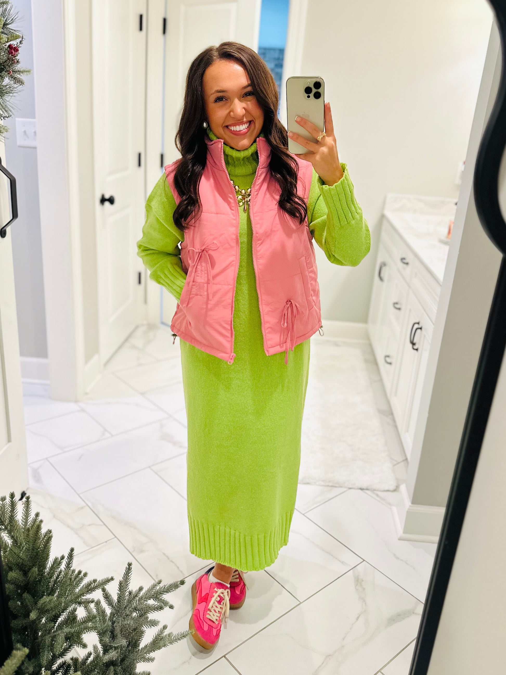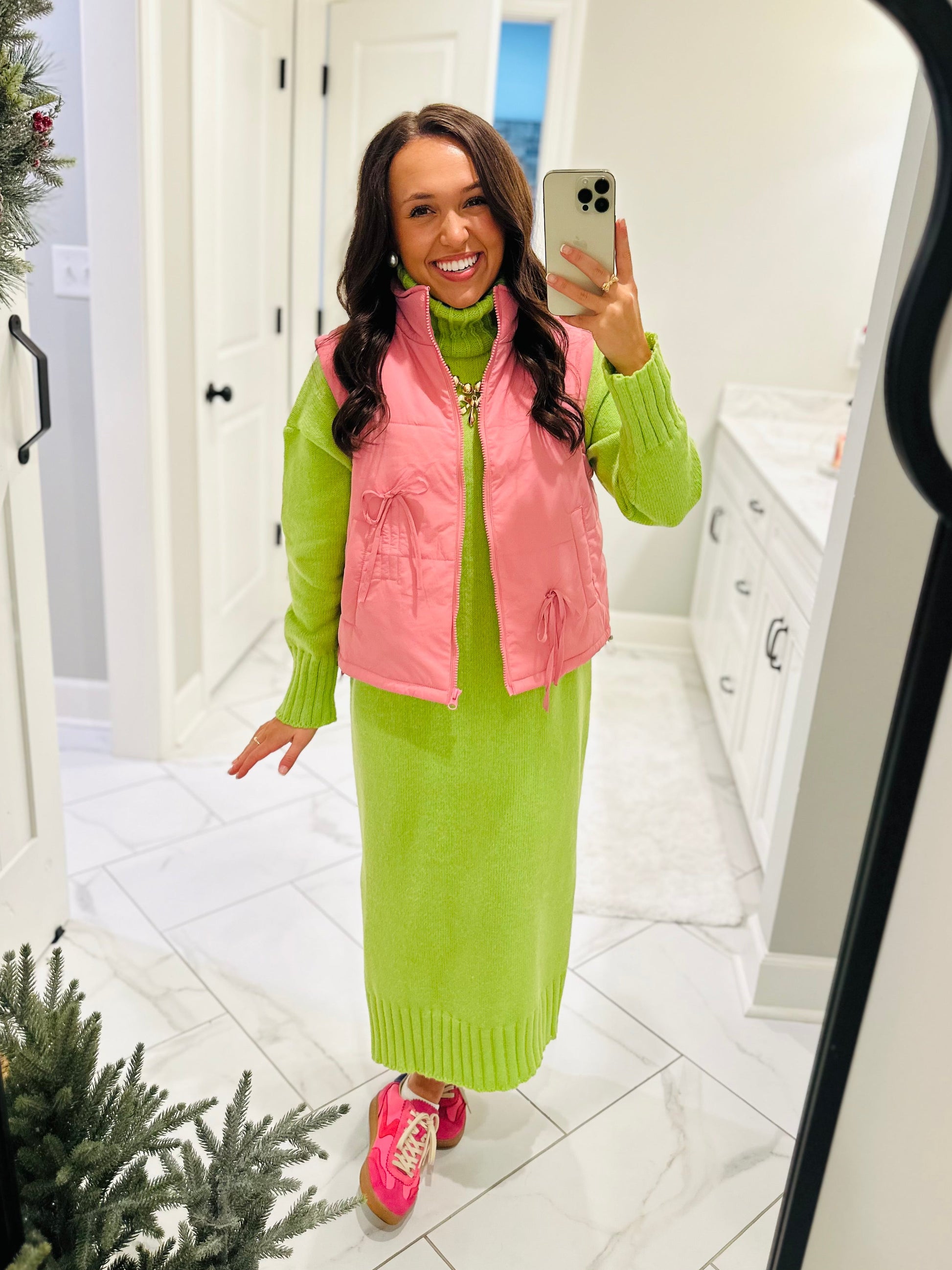 The perfect little vest has arrived! This new puffer vest will be your go-to every day this fall and winter. It features a mock neck with a front zip up. It has side pockets and is puffer material. The cute front bow detailing is the perfect addition to make it so cute and chic. It's the perfect piece for every outfit to keep you warm and cozy!