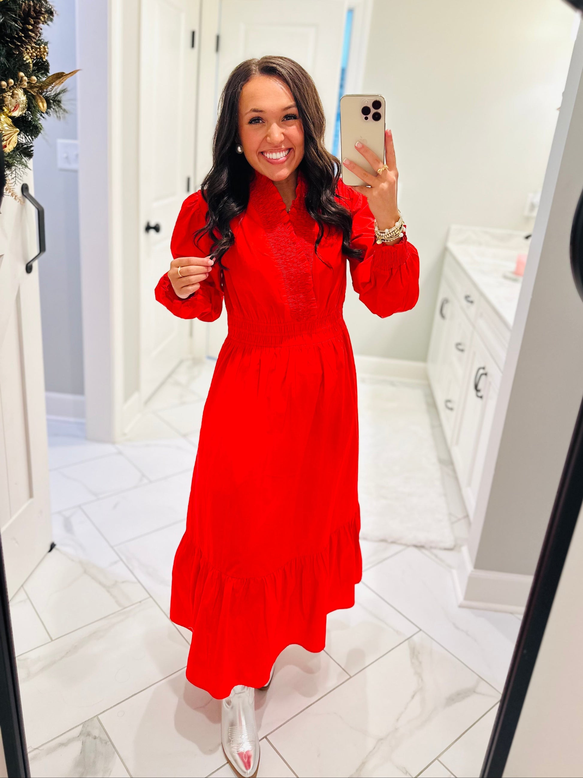 Ready to sleigh the holiday season with this new red dress! This dress features a beautiful solid red color with long sleeves, a smocked waistband, and it is midi length. The smocking ruffle detailing adds a fun but classy touch to the dress. This dress is the perfect go-to for work parties, family gatherings, or pictures with Santa. Dress it up or keep it casual - it's a staple for your wardrobe!