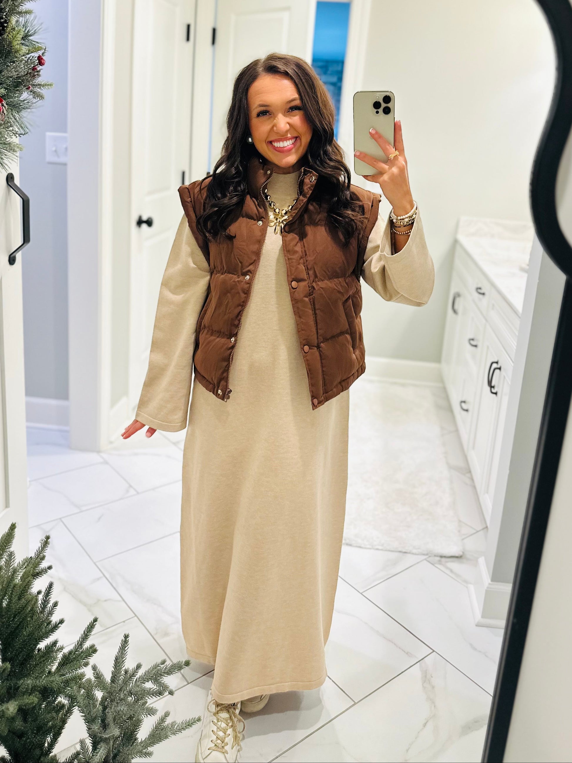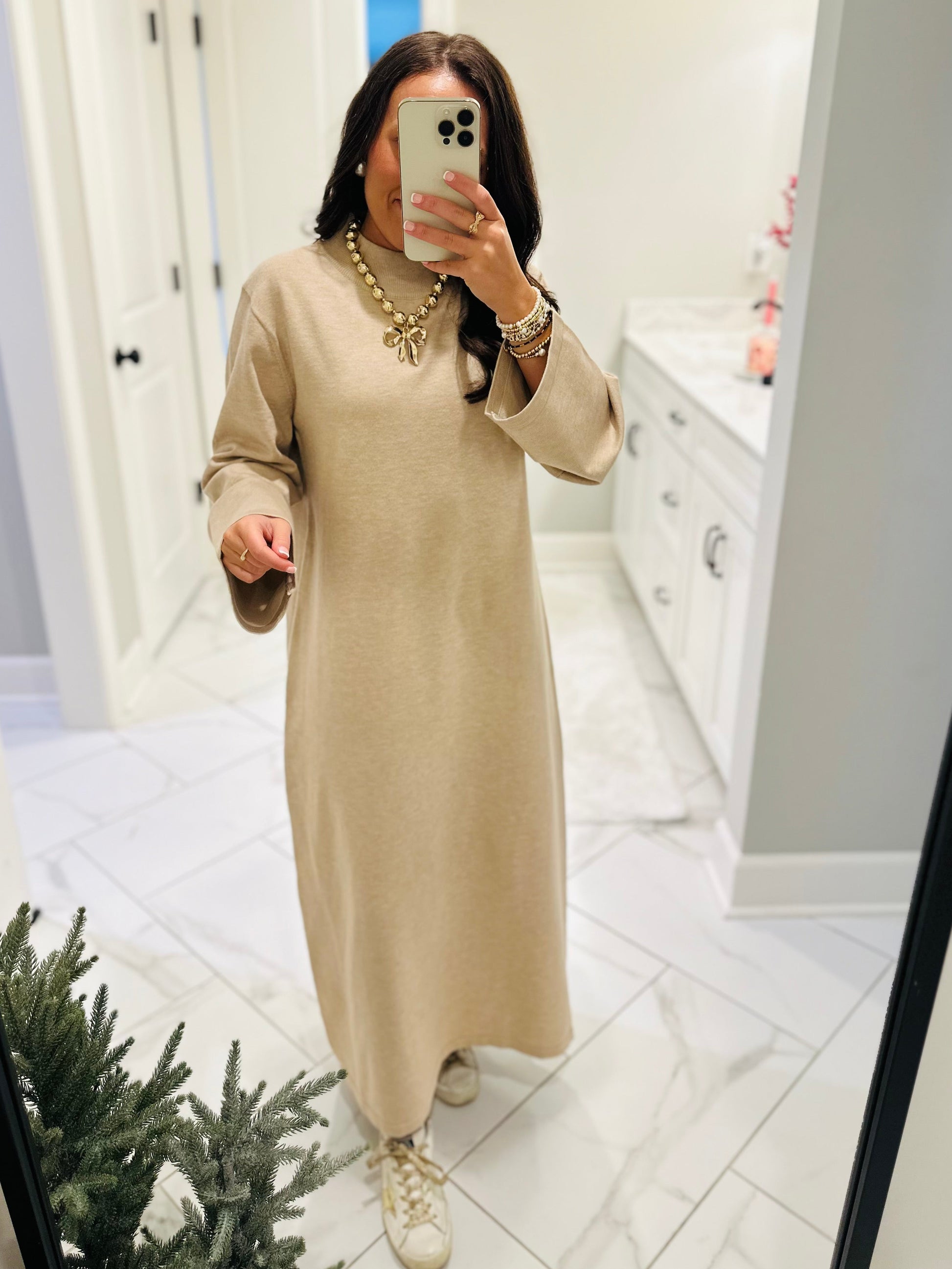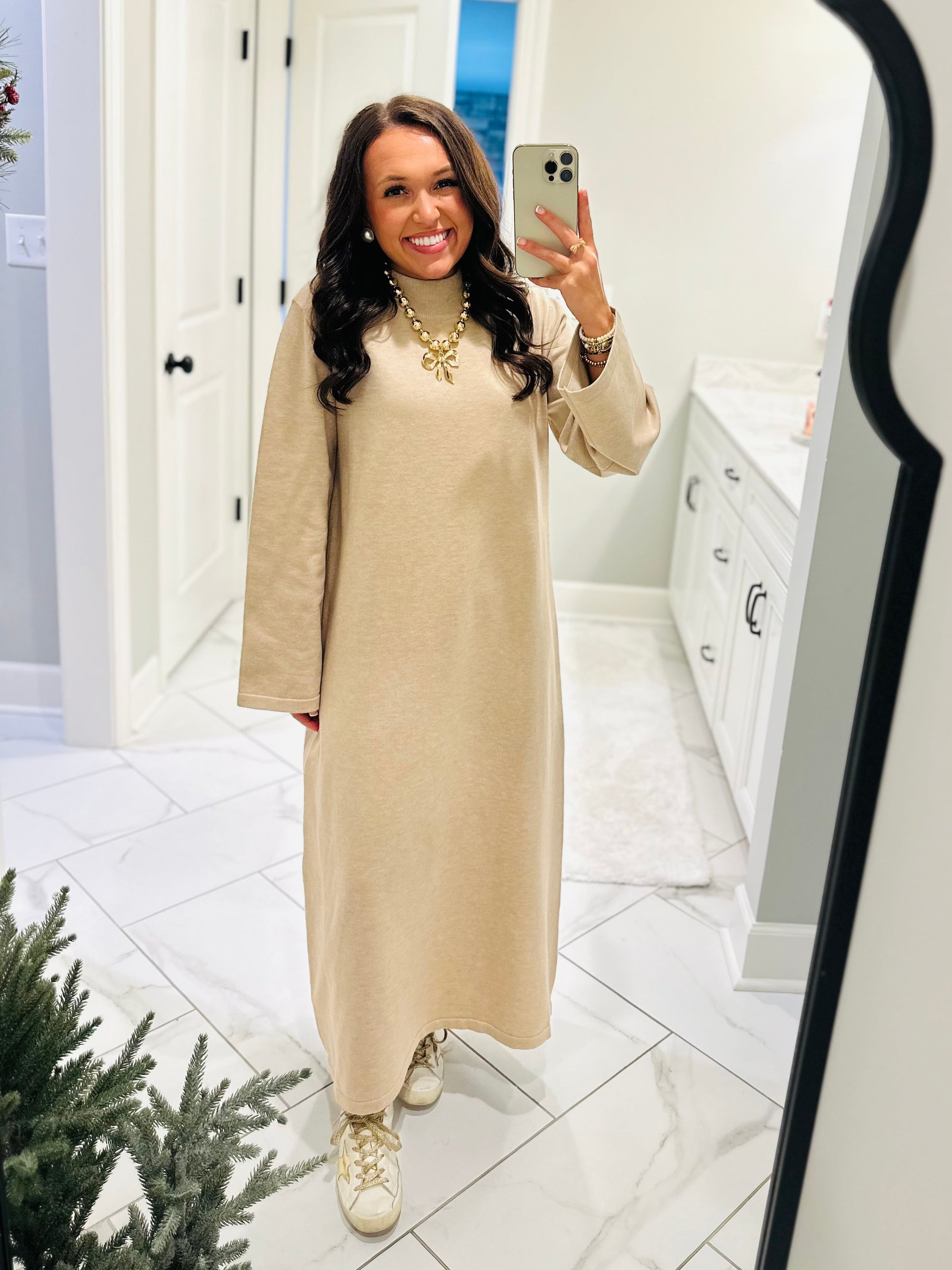 Soft, simple, and a staple is this new sweater dress! This dress features a beautiful solid sand color with a mock neckline, long sleeves, and is midi length. It is a medium weight knit making it not too thin and not too thick. It's perfect to wear by itself or layer a vest, scarf, or coat over. Dress it up or keep it casual - this dress is your go to this fall and winter!