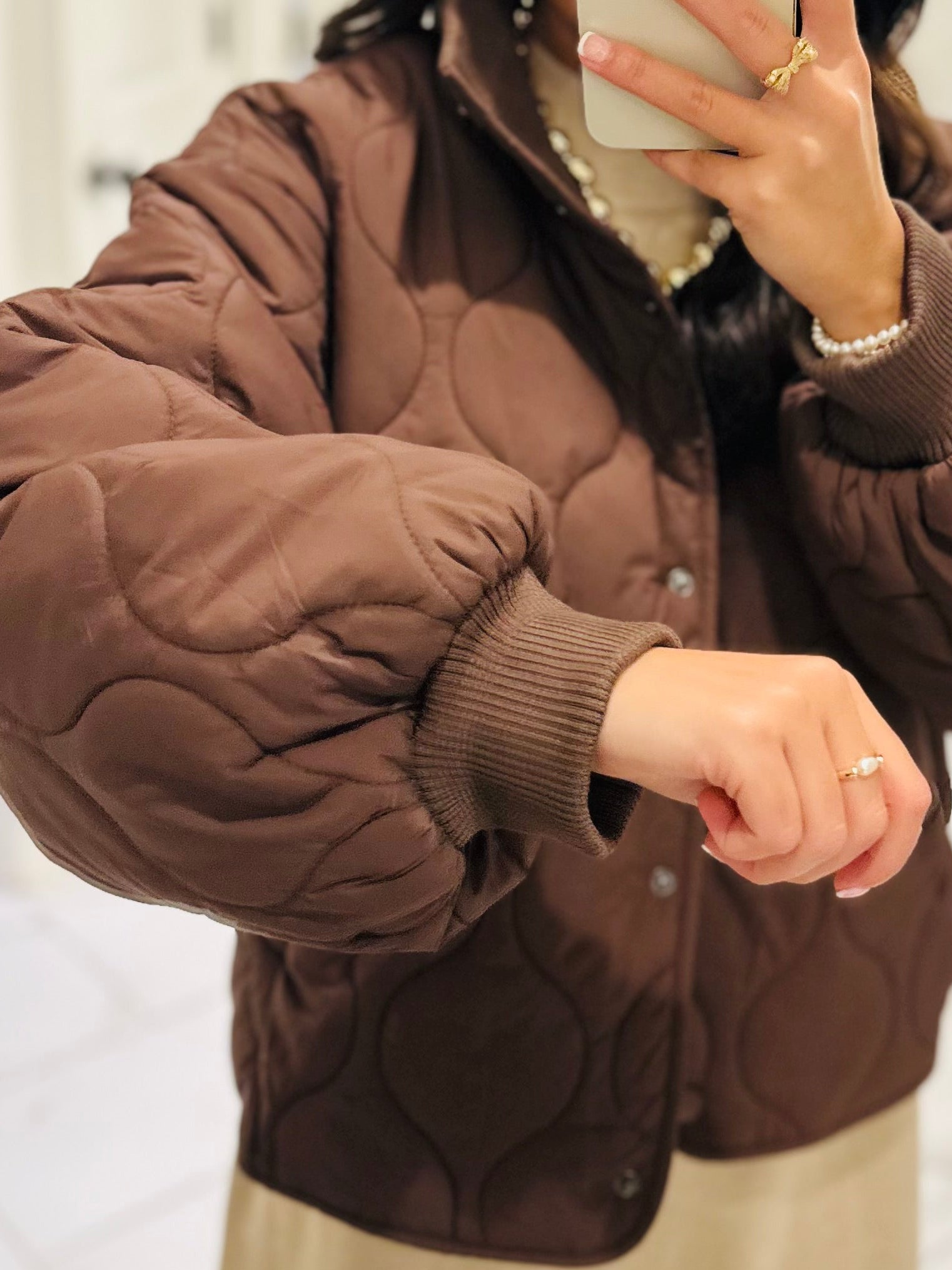 Cozy up in this new quilted jacket! It features a beautiful chocolate brown color in a quilted puffer design. It has long puff sleeves and an easy button-down front. It has a high neckline and side pockets. This is the perfect everyday jacket to keep you warm and chic!