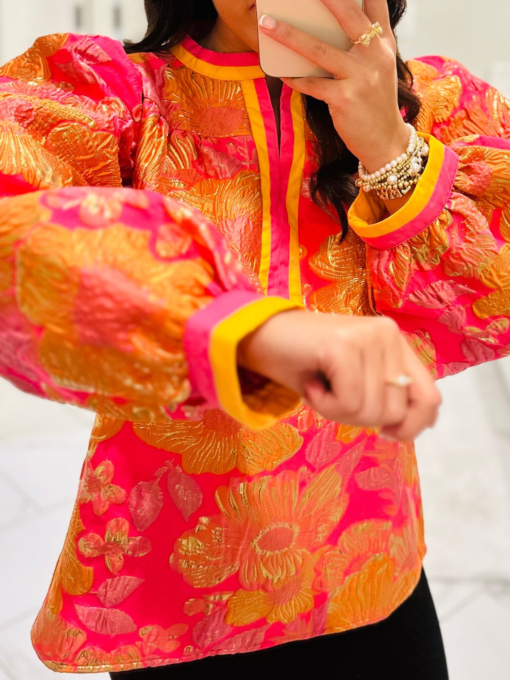 Neon pink perfection. This new top is the most beautiful piece! It features a fun neon pink floral jacquard print with long sleeves, v-neck neckline, and contrast binding detail. This top will be your go-to top for any occasion!