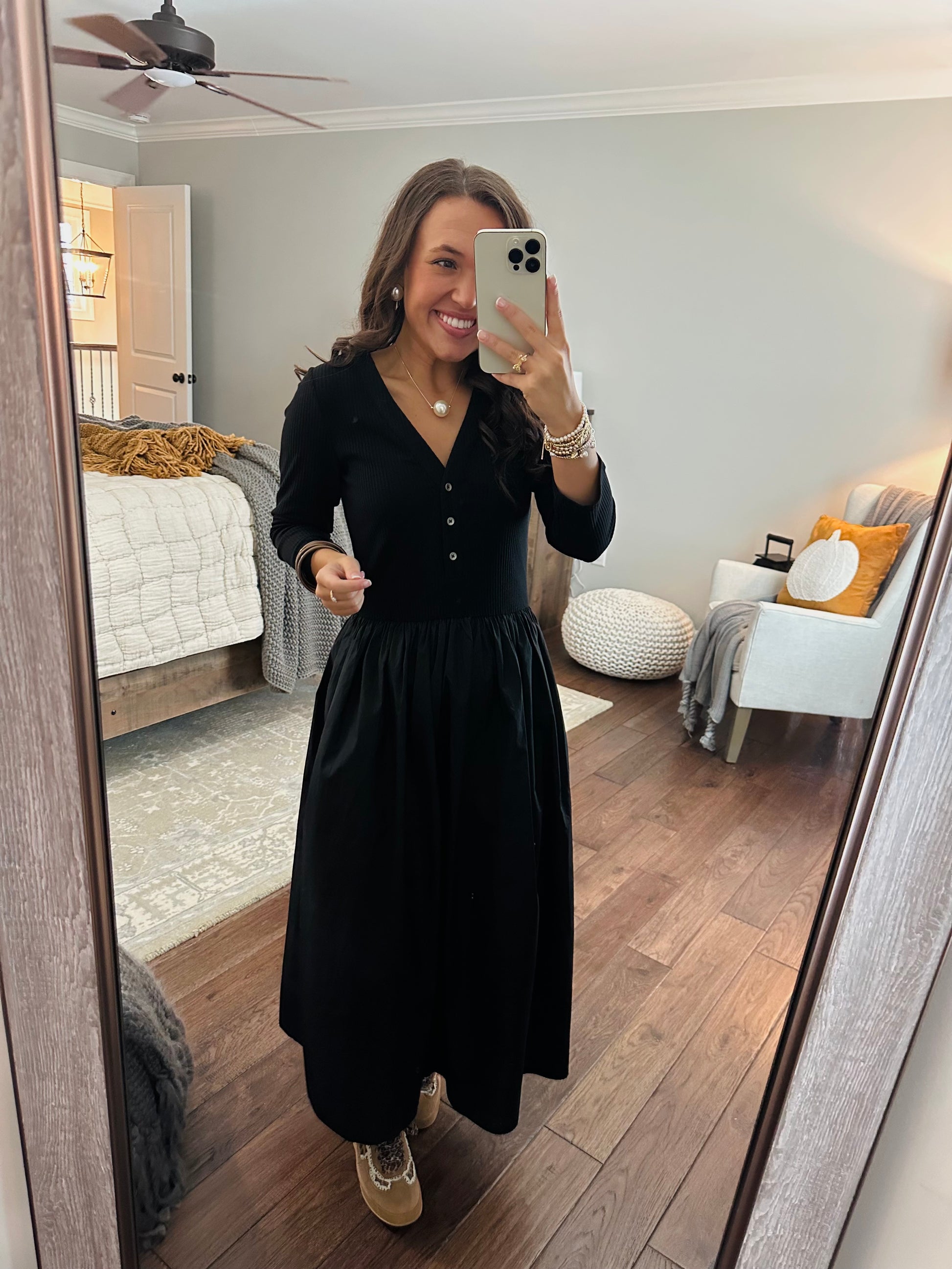 Make an effortless statement in this ultra flattering, versatile dress! This dress features a rib knit bodice and flared, gathered skirt for a beautifully balanced silhouette, finished with long sleeves, a split neckline, and button detail. A dropped waist and functional pockets add comfort and ease. Style with boots and a crossbody or dress it up with heels and bold accessories. It's the perfect everyday dress!