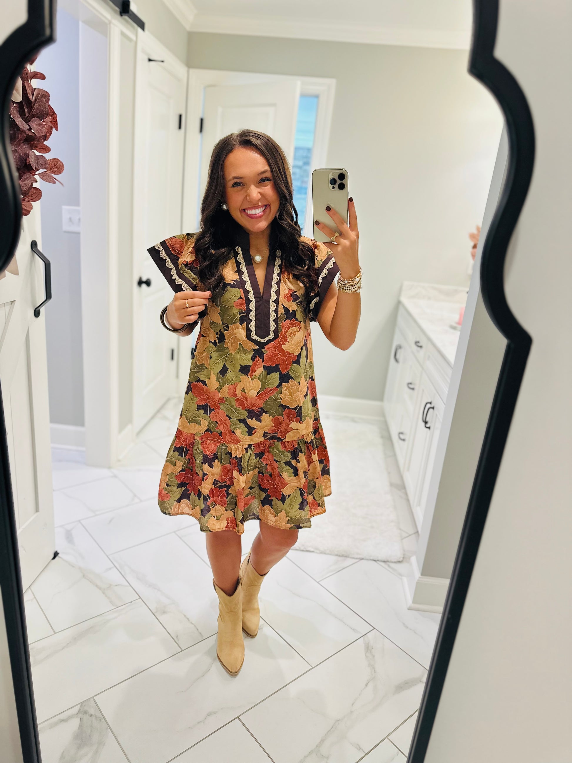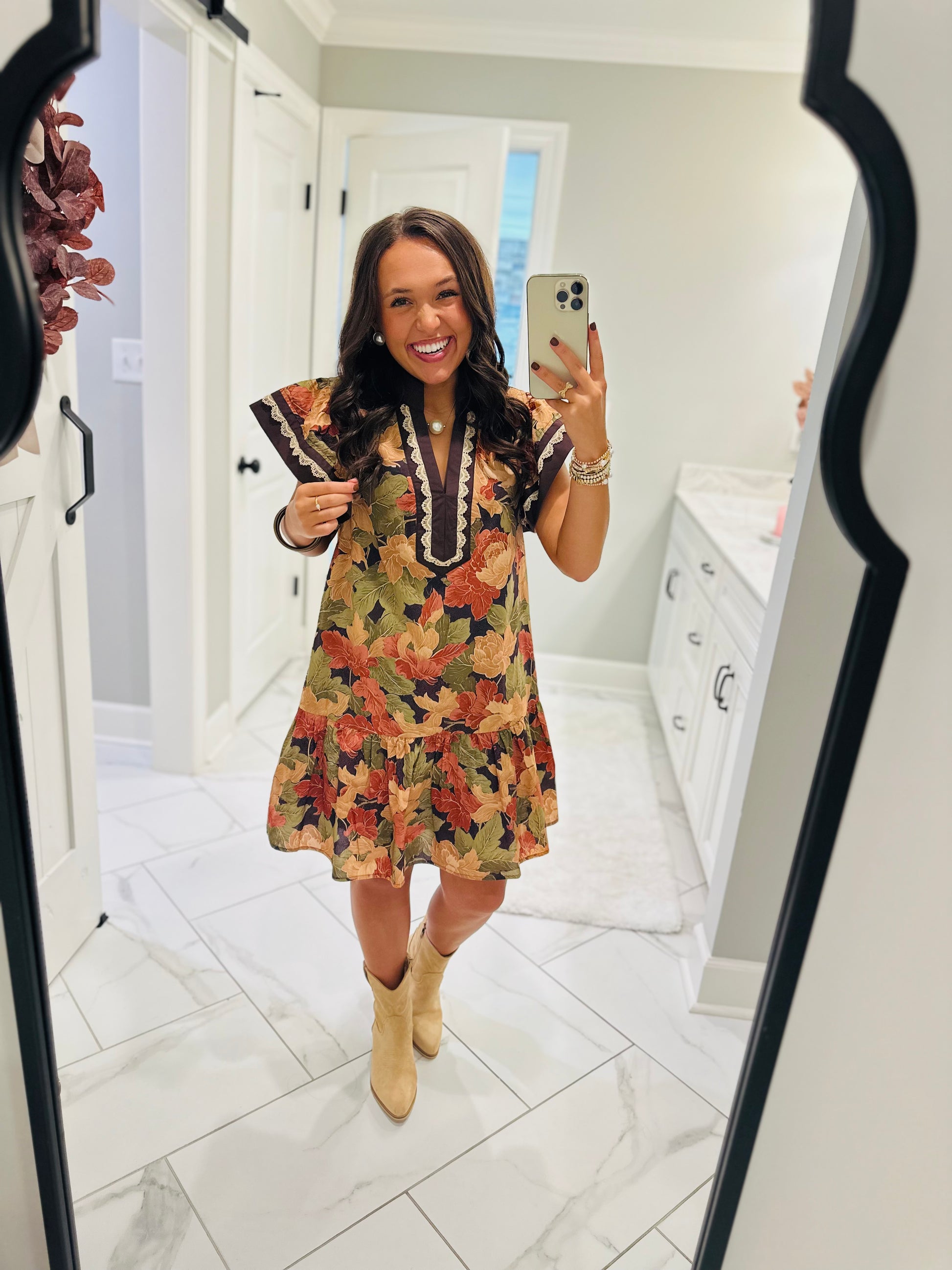 We're falling for this new brown floral dress! The color combo and the print is just absolutely gorgeous. This dress features a beautiful floral print with flutter sleeves, scallop and contrast detailing on the neckline and sleeves, and hidden side pockets. This dress is perfect to wear with your favorite pair of boots. It's the cutest dress for this time of year!