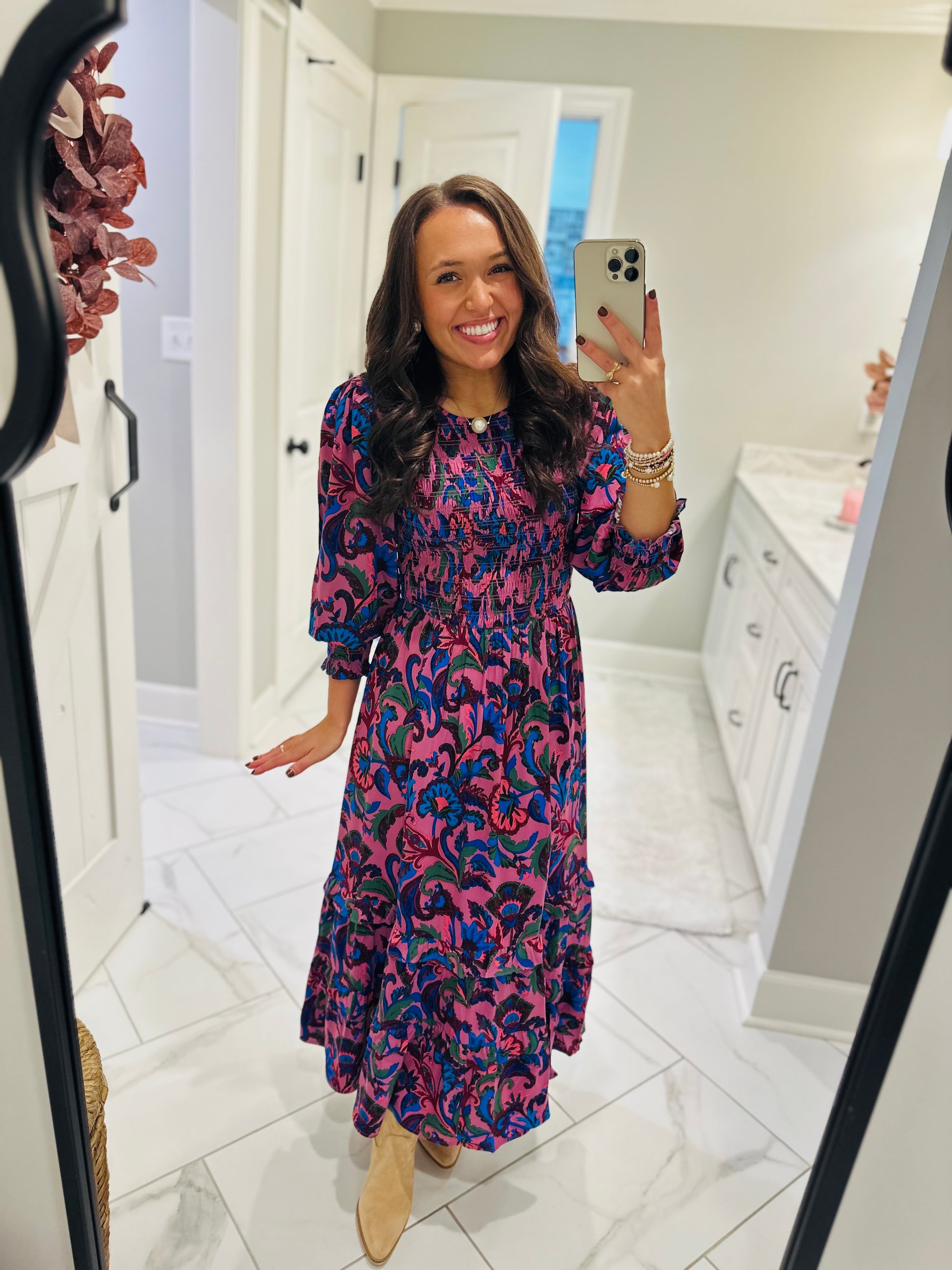 You're going to fall in love with this dress! This beautiful dress features a smocked bodice, ruffle tiered skirt, balloon sleeves, and a gorgeous floral pattern. Style this dress with ankle boots, a cute bag, and statement earrings for the perfect fall look. Layer a cardigan or coat over this dress for the cooler days!