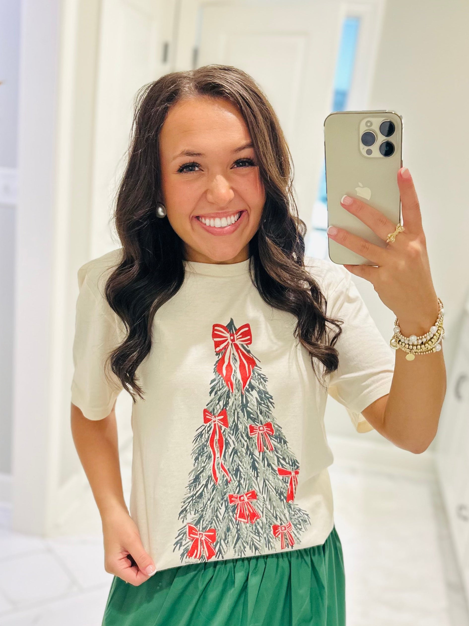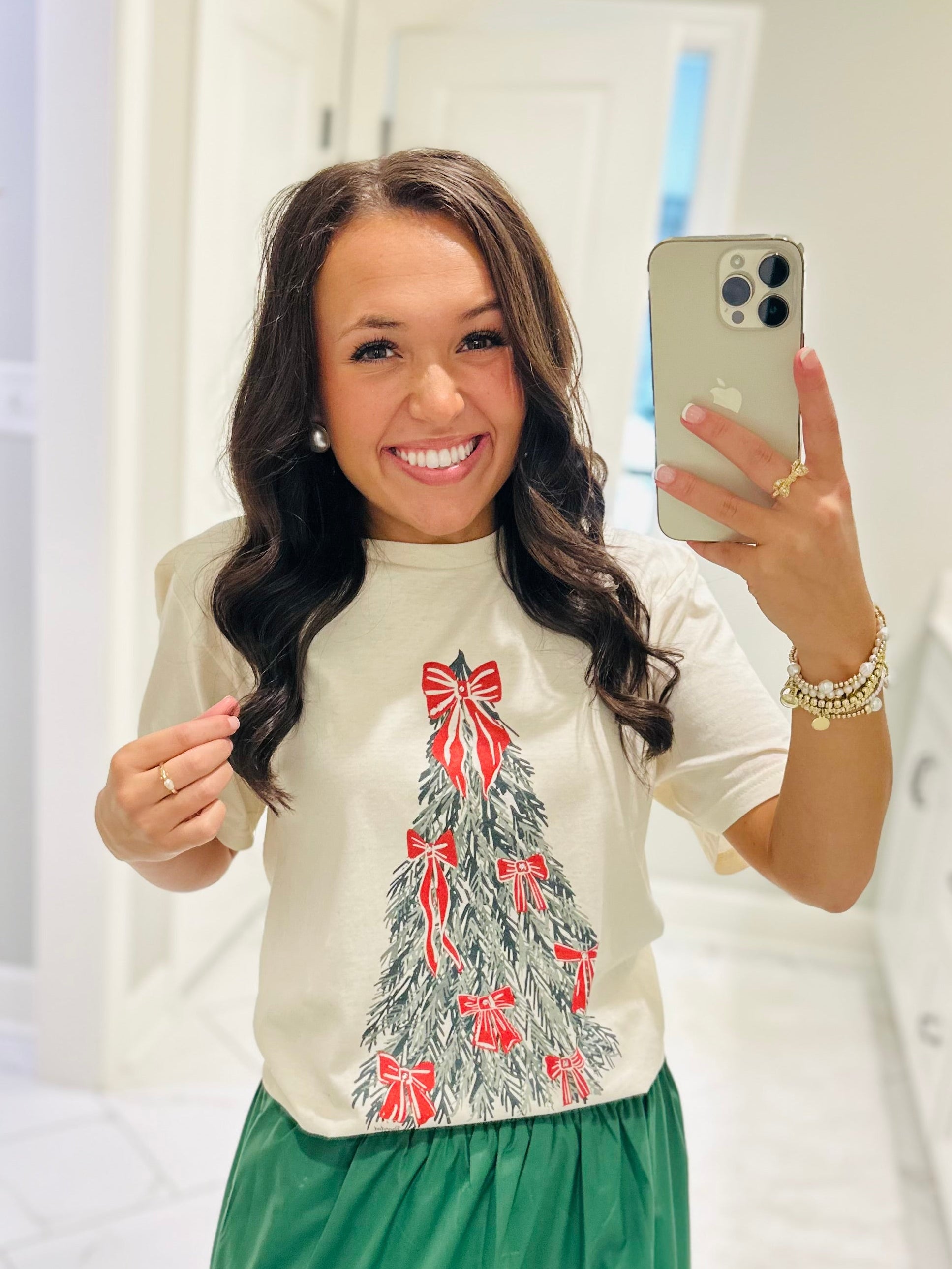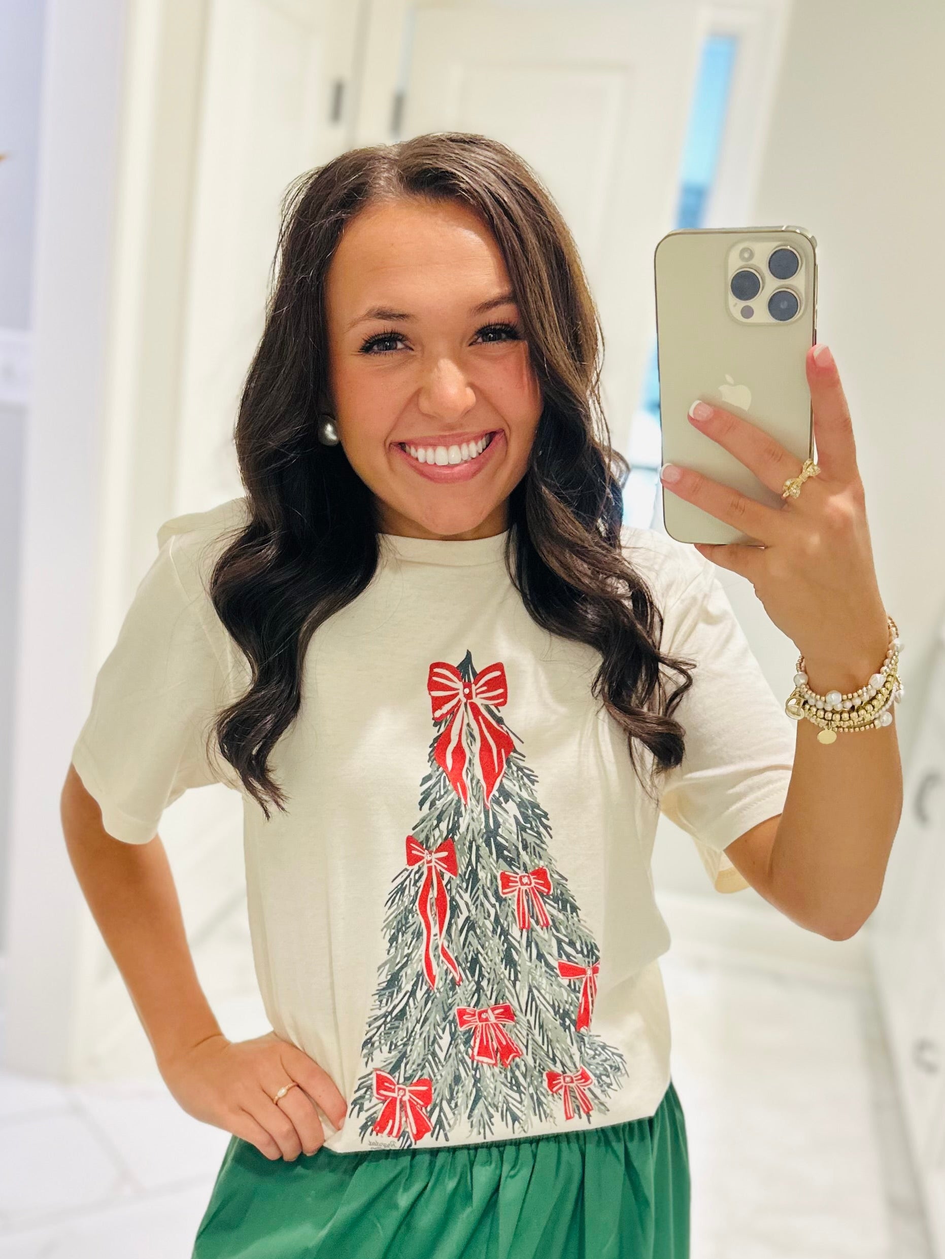 All spruced up in this adorable new tee! This tee features the prettiest and simplest watercolor Christmas tree and bow design with crystal embellishments. It's the perfect tee for every event this holiday season. Layer a cardigan over it or a turtleneck underneath it. There are so many ways to style this adorable tee!