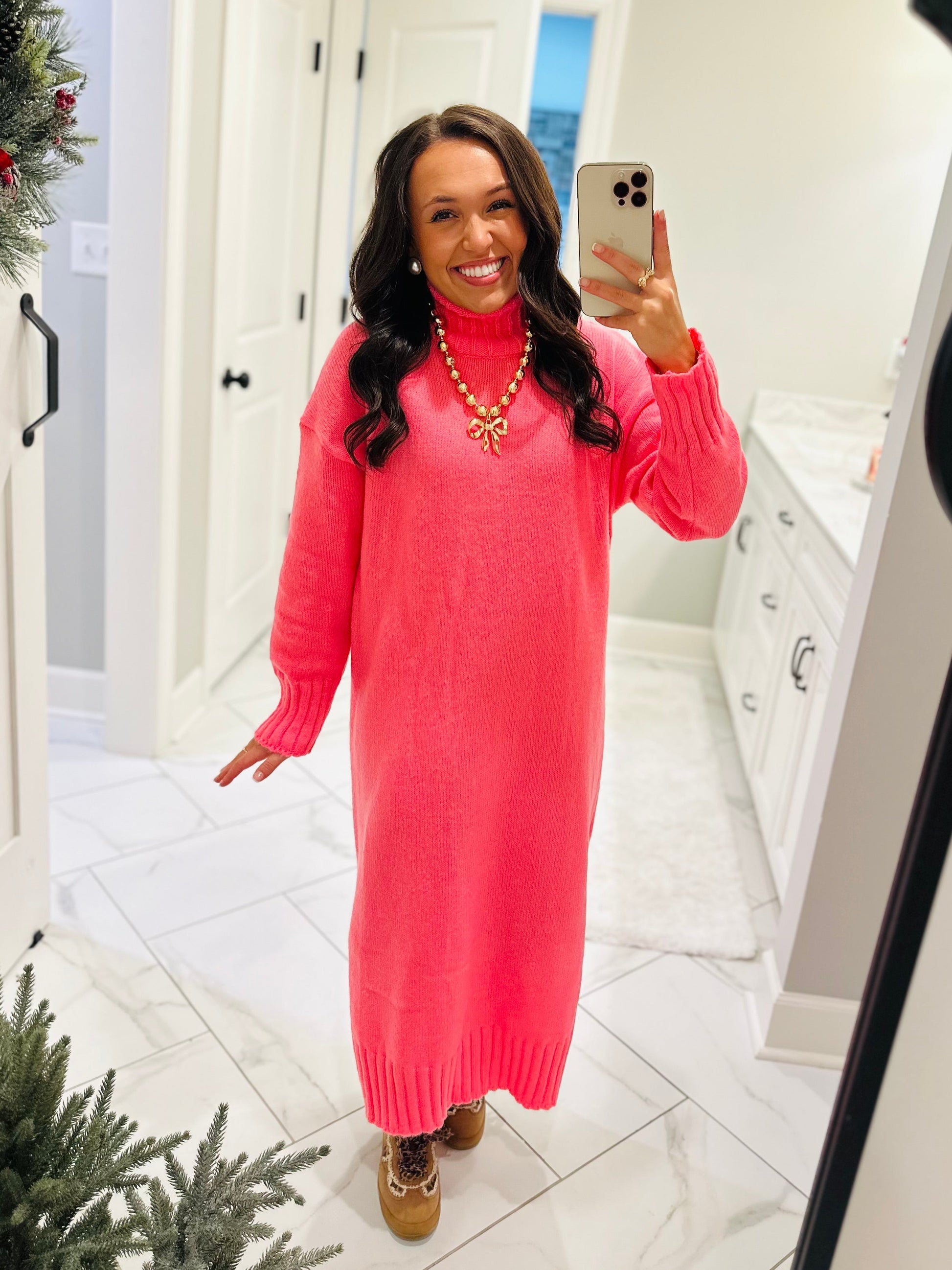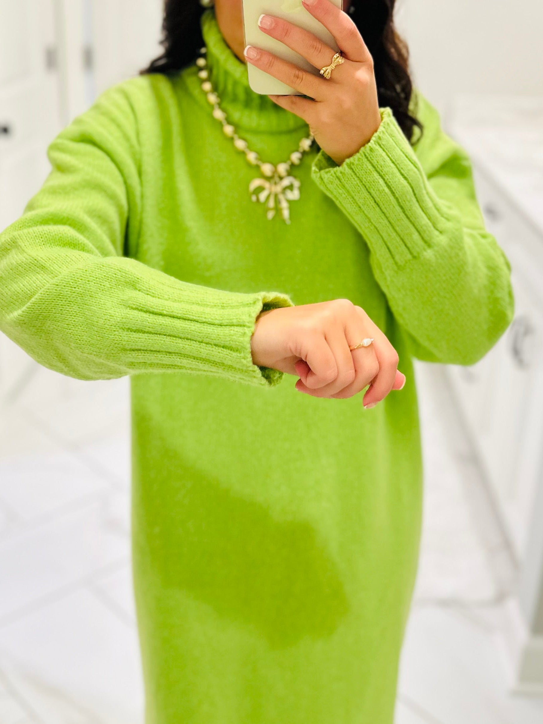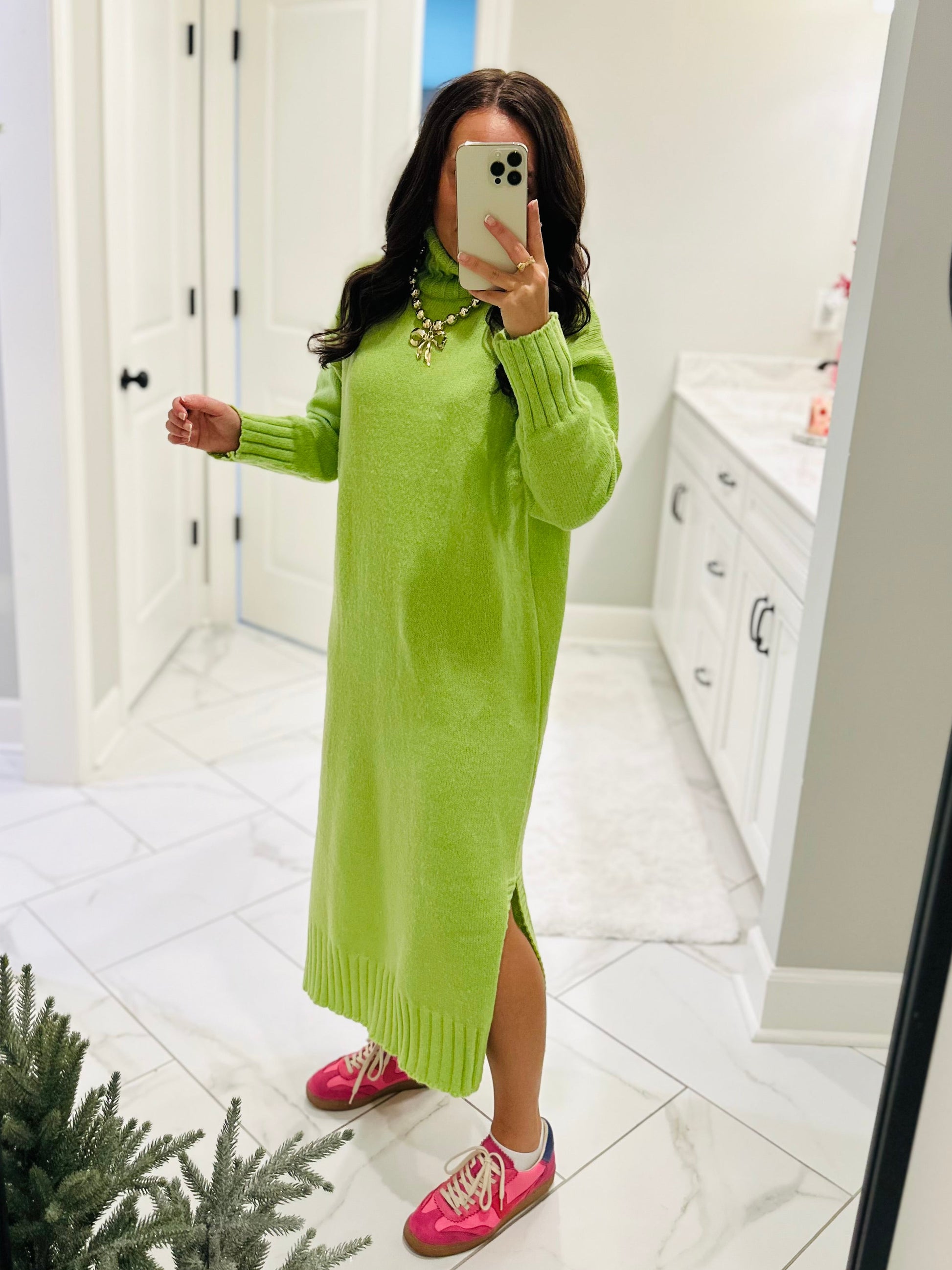 Stay cozy this fall and winter with our new sweater dresses!! These dresses feature a turtleneck neckline, long sleeves with ribbed cuffs, and a drop shoulder. There are side slits on each side. These fit true-to-size and have a relaxed fit. 3 color options are available: Lime Green, Pink, & Royal Blue. Style these with sneakers or booties and layer a vest or coat over them!