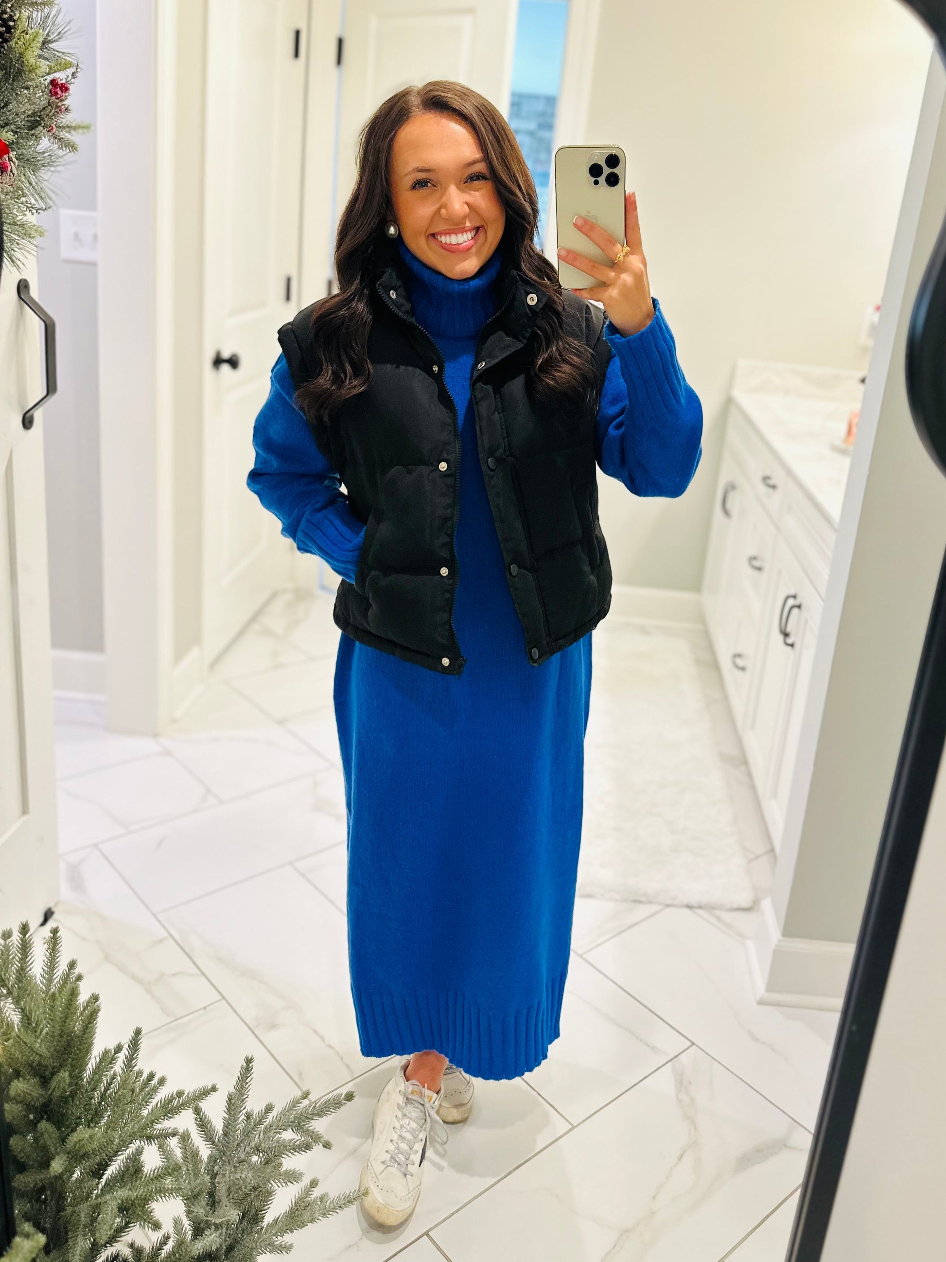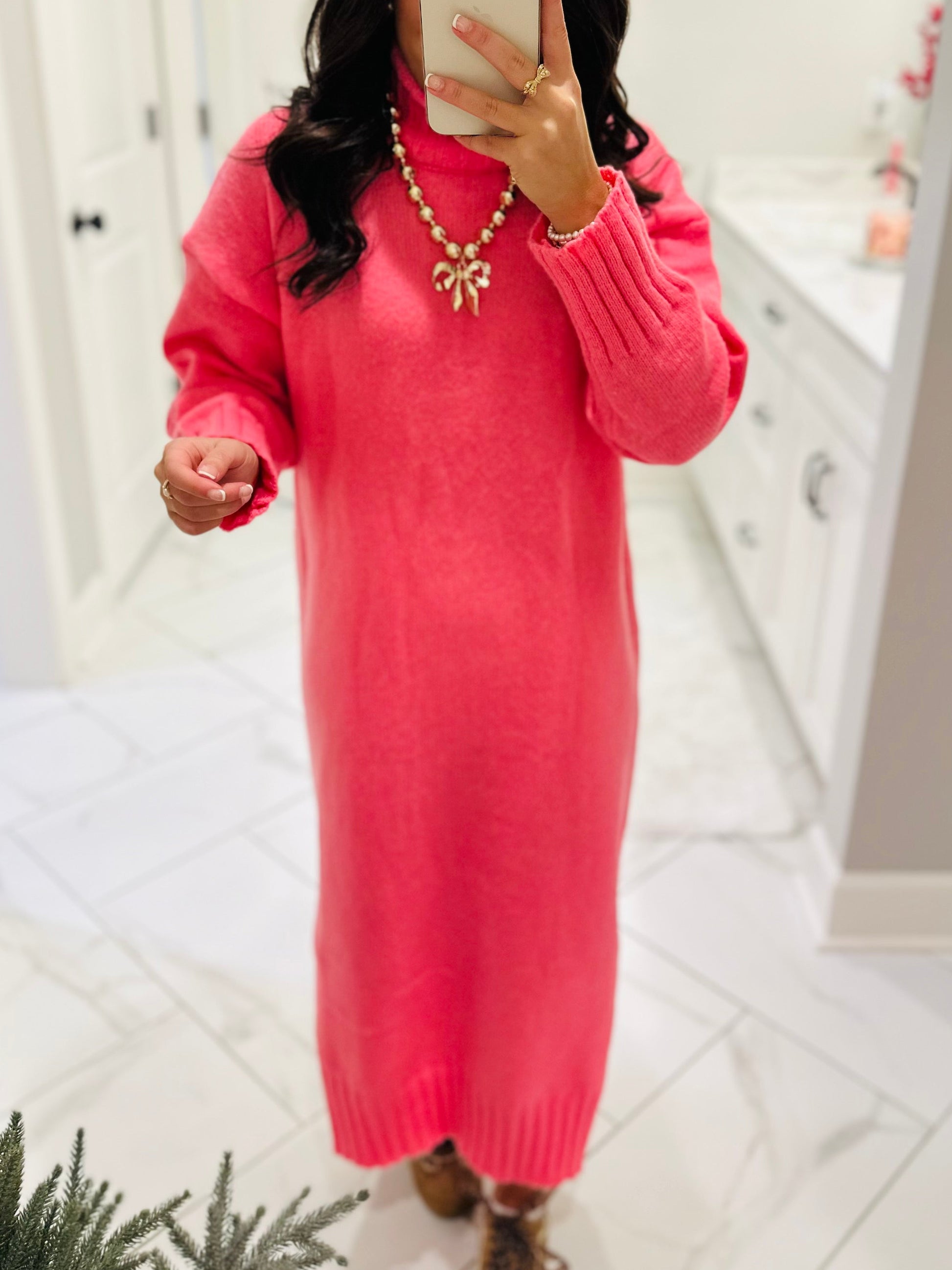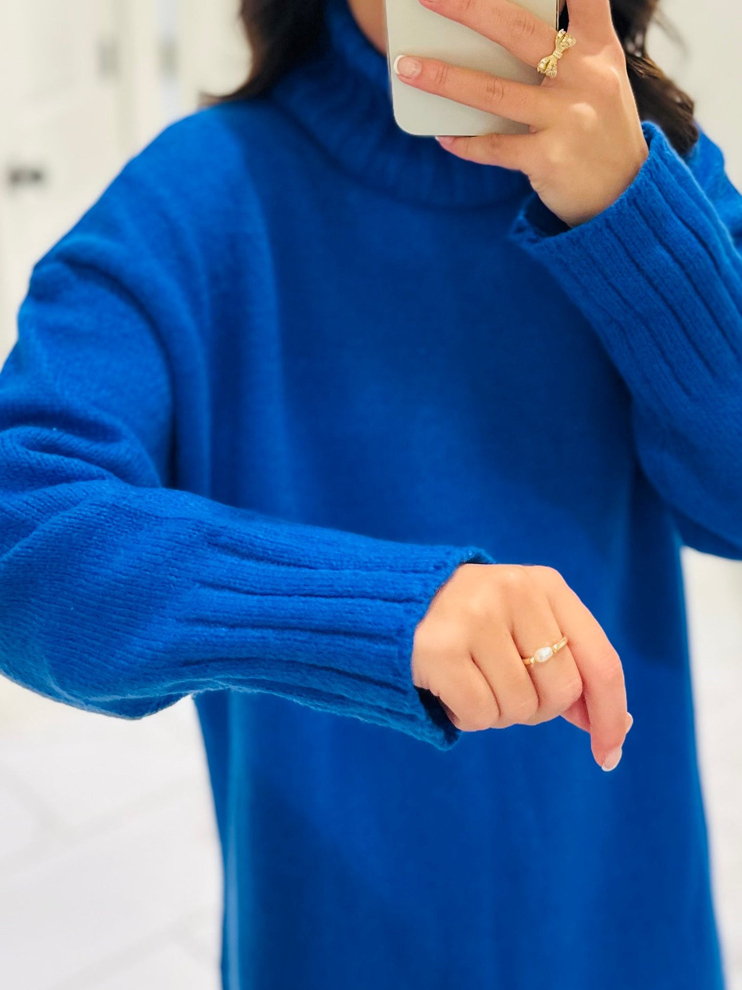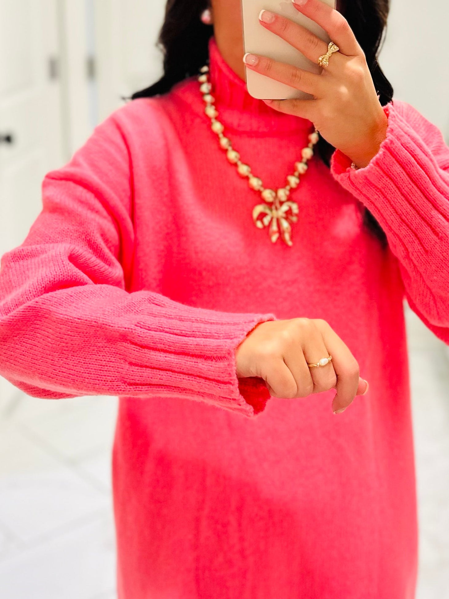 Stay cozy this fall and winter with our new sweater dresses!! These dresses feature a turtleneck neckline, long sleeves with ribbed cuffs, and a drop shoulder. There are side slits on each side. These fit true-to-size and have a relaxed fit. 3 color options are available: Lime Green, Pink, & Royal Blue. Style these with sneakers or booties and layer a vest or coat over them!