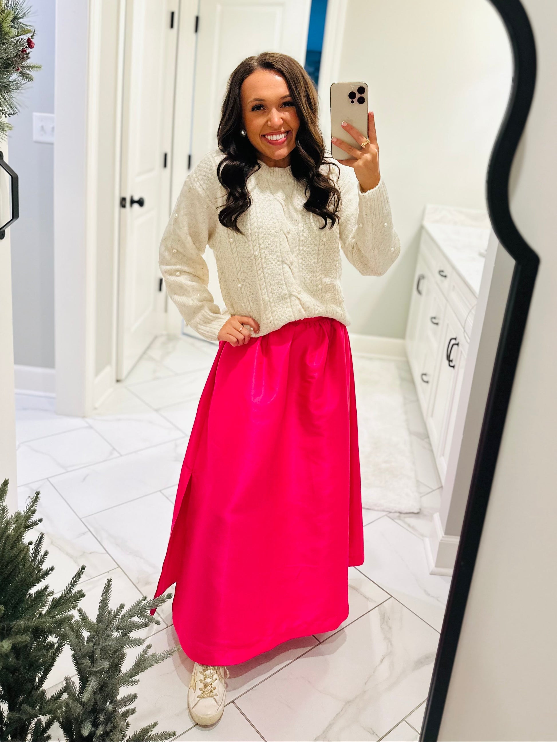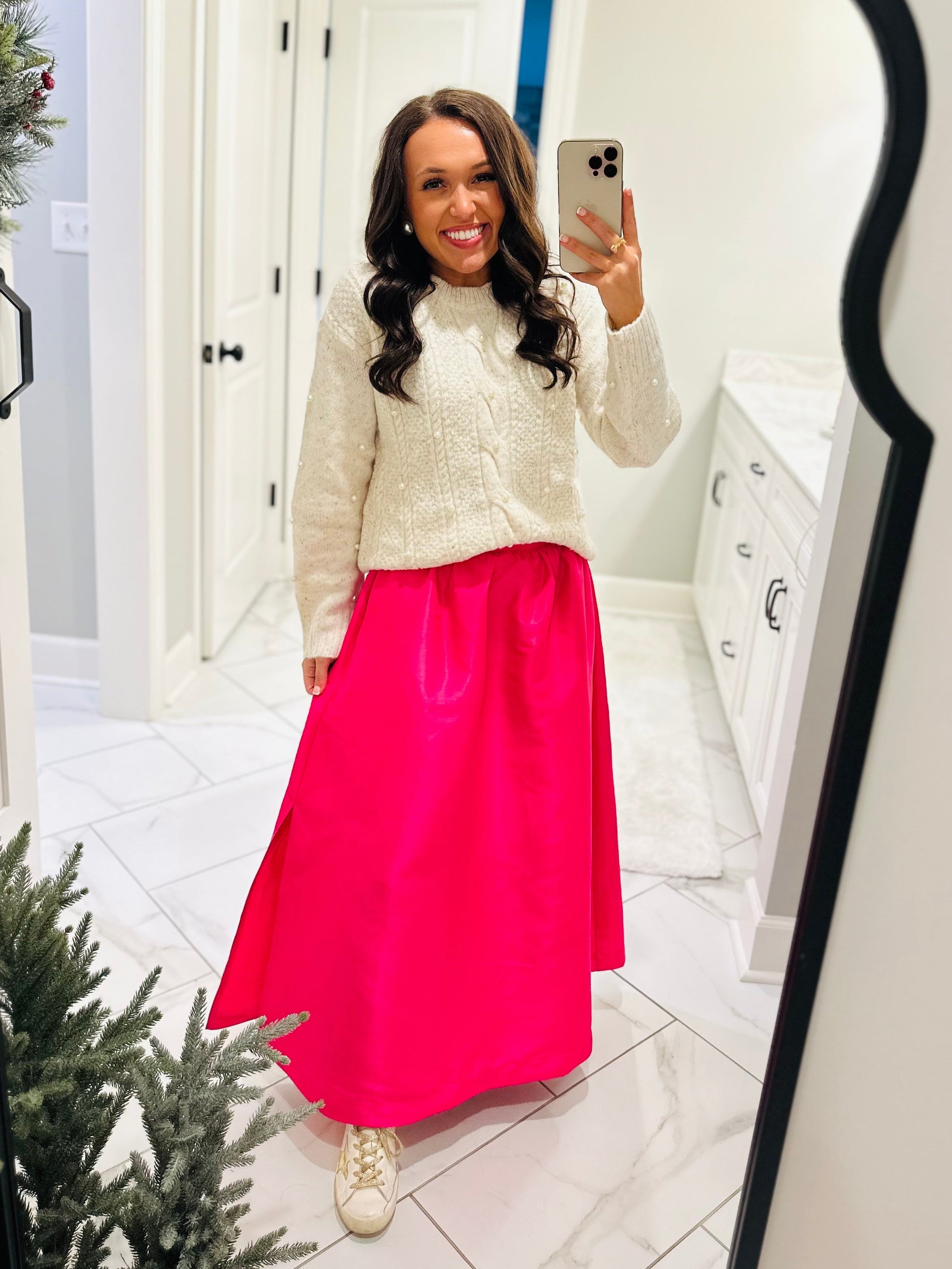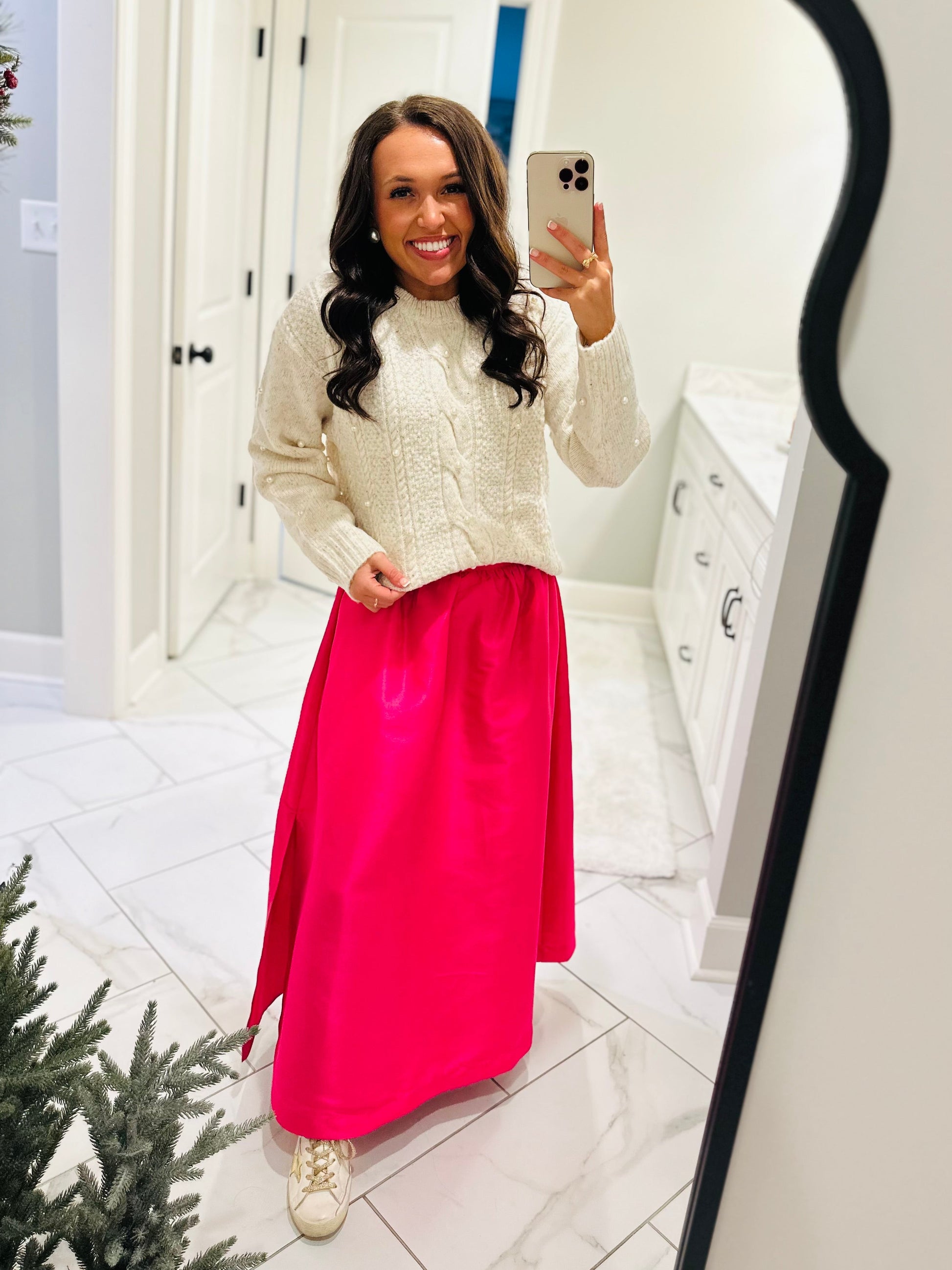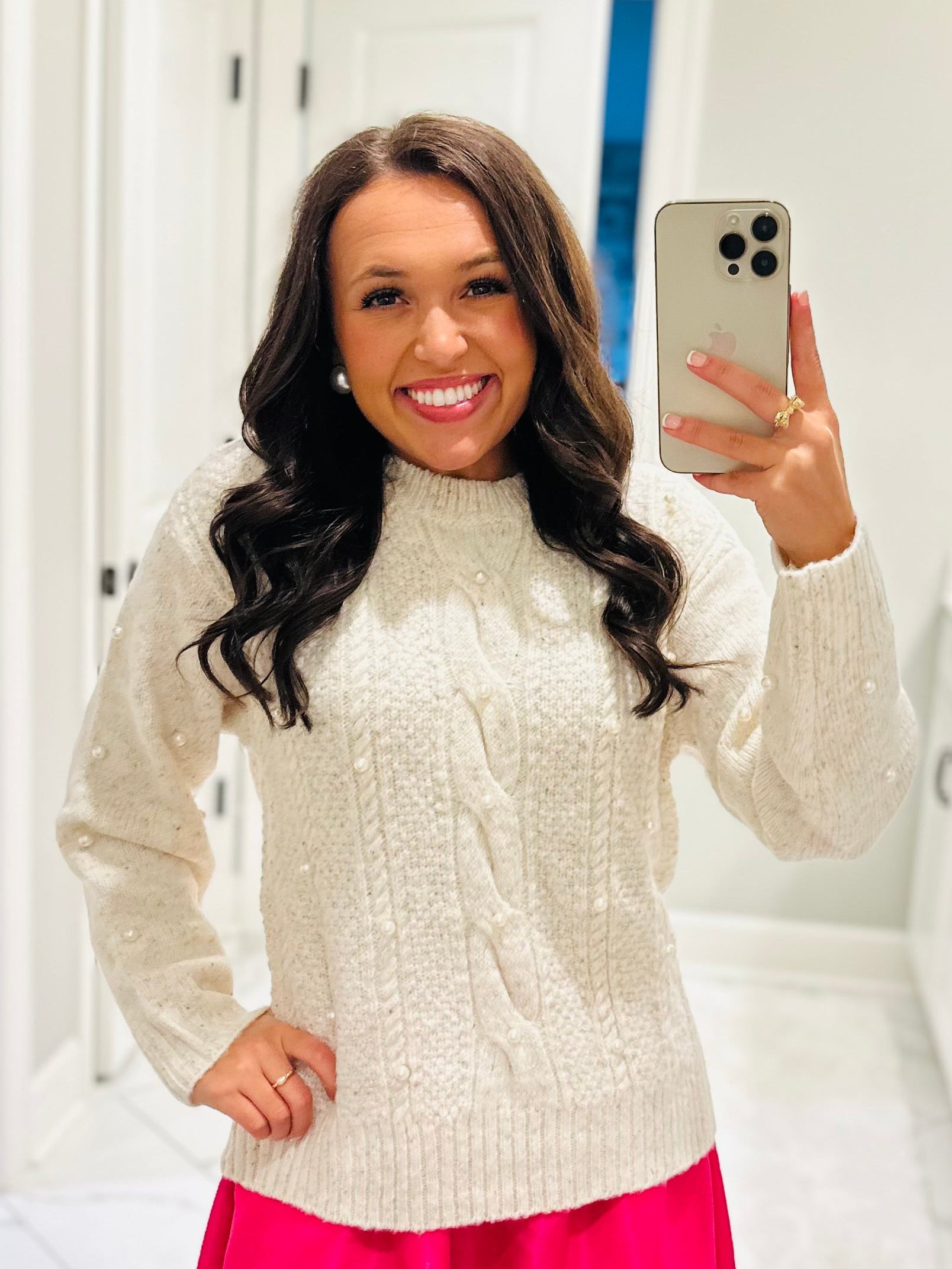 All-day compliments will be coming your way when you step out in the Wynter Pearl Sweater! This sweater features pretty pearls on a warm soft sweater with long sleeves and dropped shoulders. It has a round neckline and can be easily be paired with black denim jeans for a cute winter look.